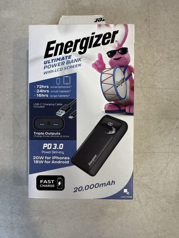 ENERGIZER ULTIMATE POWER BANK WITH LCD SCREEN AND TRIPLE OUTLETS, 20,000MAH
