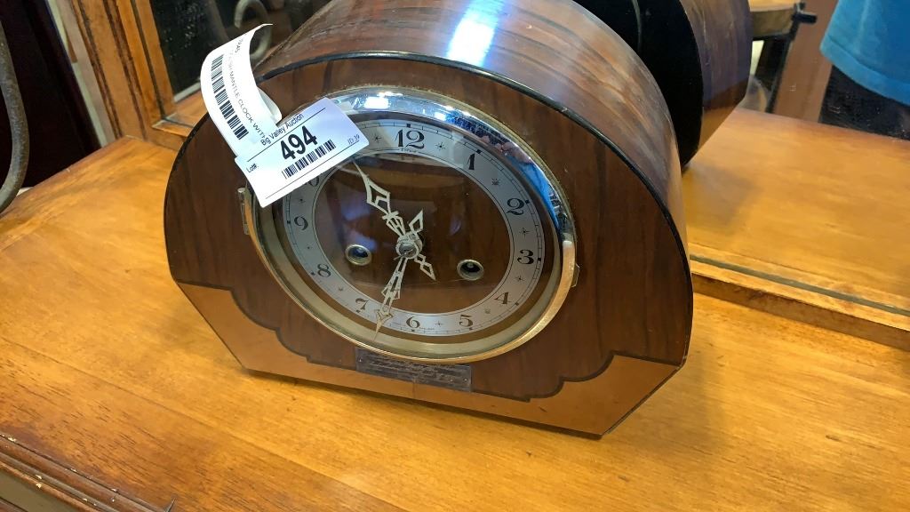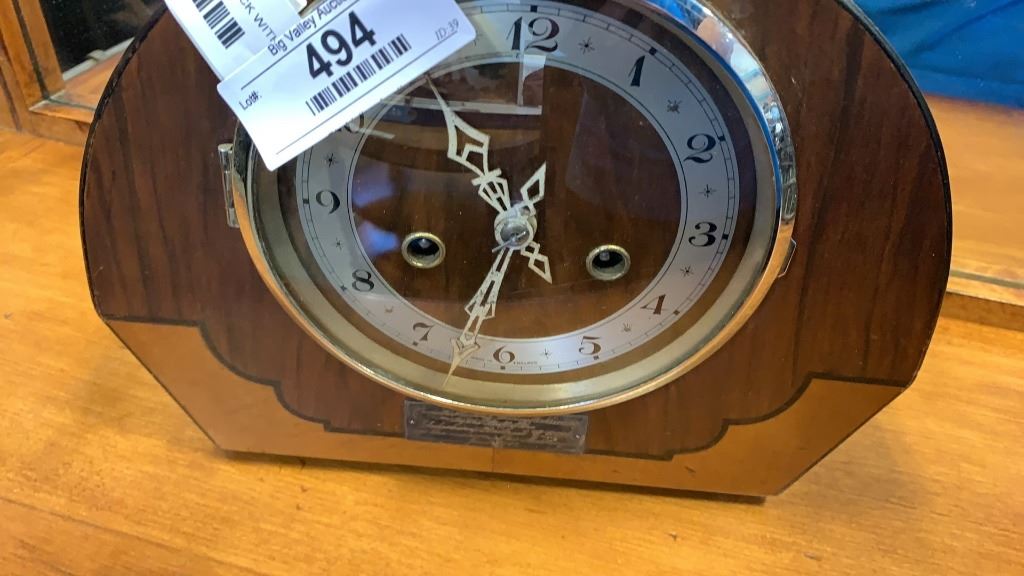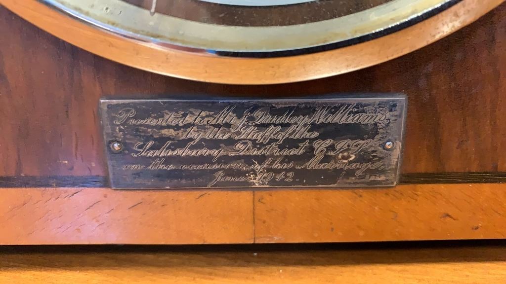 ENFIELD ENGLISH MANTLE CLOCK WITH METAL PLACARD DATED 1942