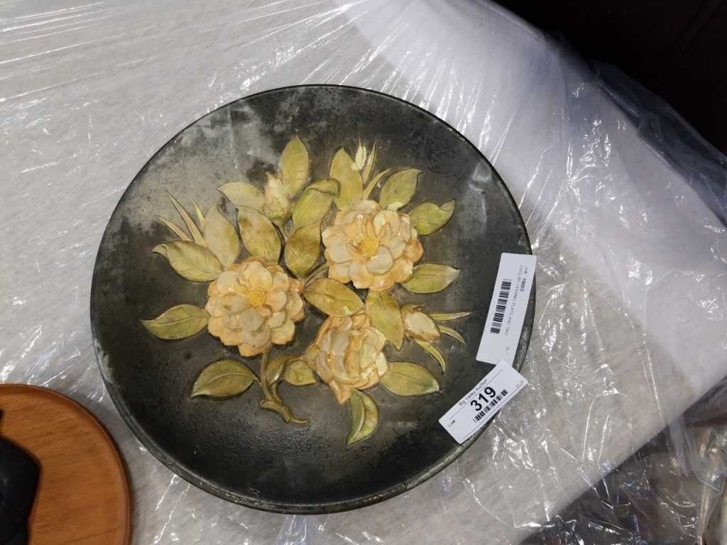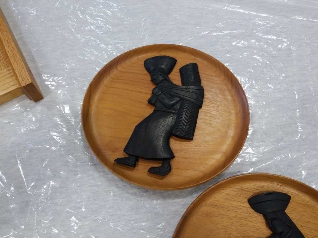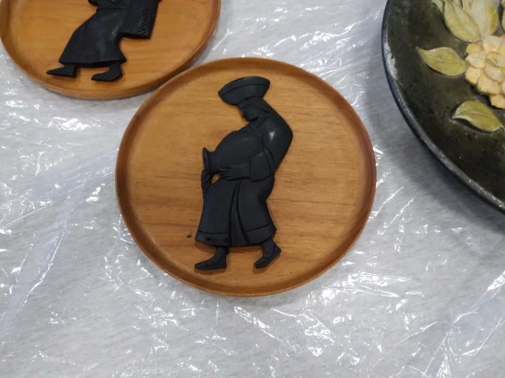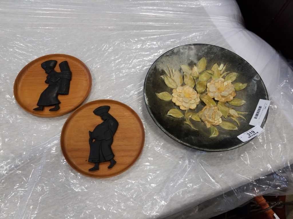 ENGLISH CERAMIC PLATE AND TWO CARVED WOODEN DISHES