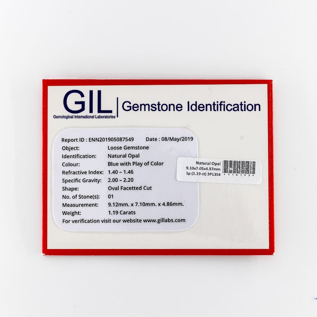 EXCEPTIONAL CERTIFIED 1.19 CT BLUE COLOR PLAY OPAL. FINE OVAL CUT MEASURING 9.12 x 7.10 x 4.86 mm. THIS FIRE OPAL DISPLAYS OUTSTANDING COLOR AND VIVID TONE WITH EXCELLENT CLARITY . INCREDIBLE LUSTER & BRILLIANCE . A MUST HAVE FOR ANY COLLECTOR. READY TO MOUNT
