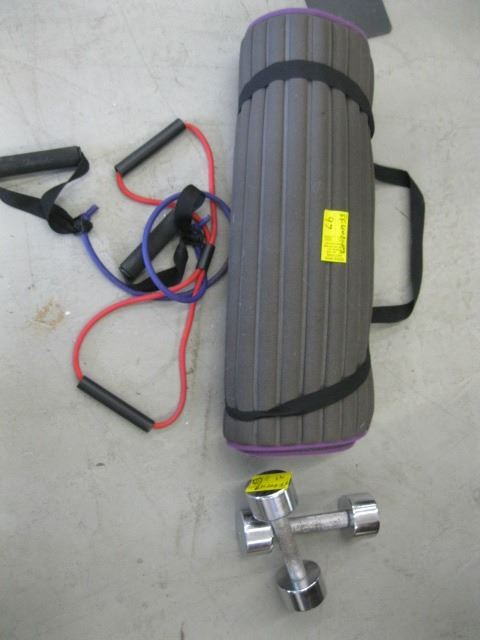 EXERCISE MAT, DUMBBELLS, RUBBER BUNGEES