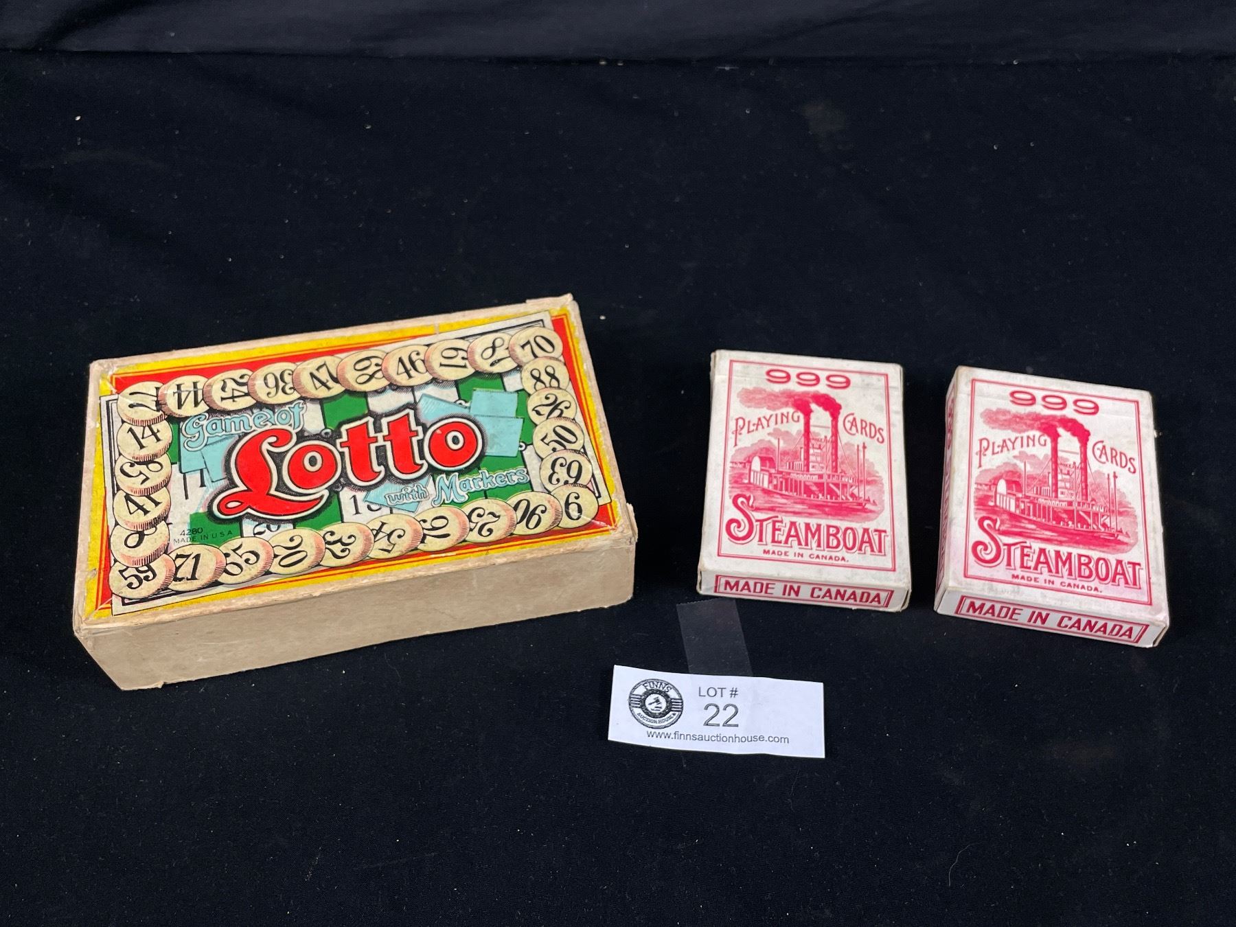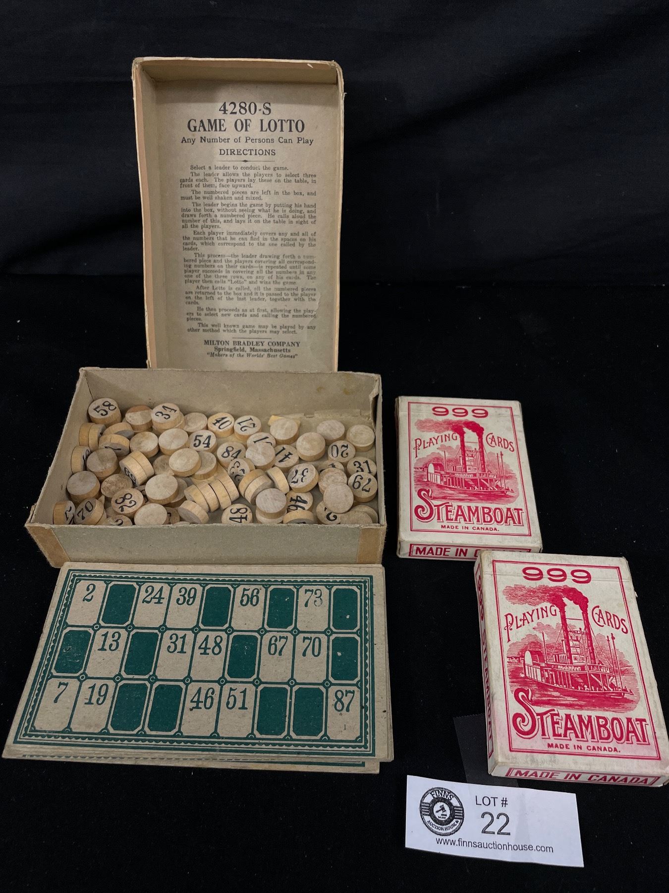 Early 1900's Lotto Game (All Original) & 2 Packs Of Vintage Steamboat Playing Cards
