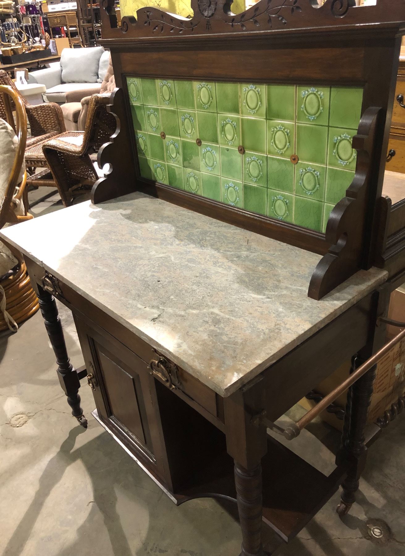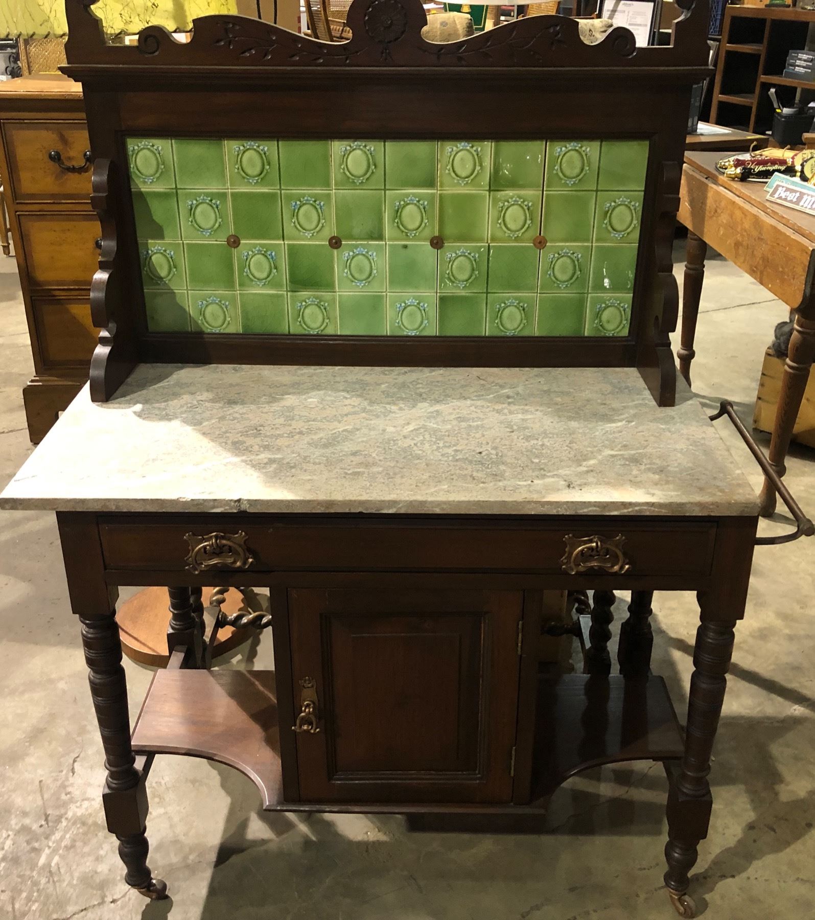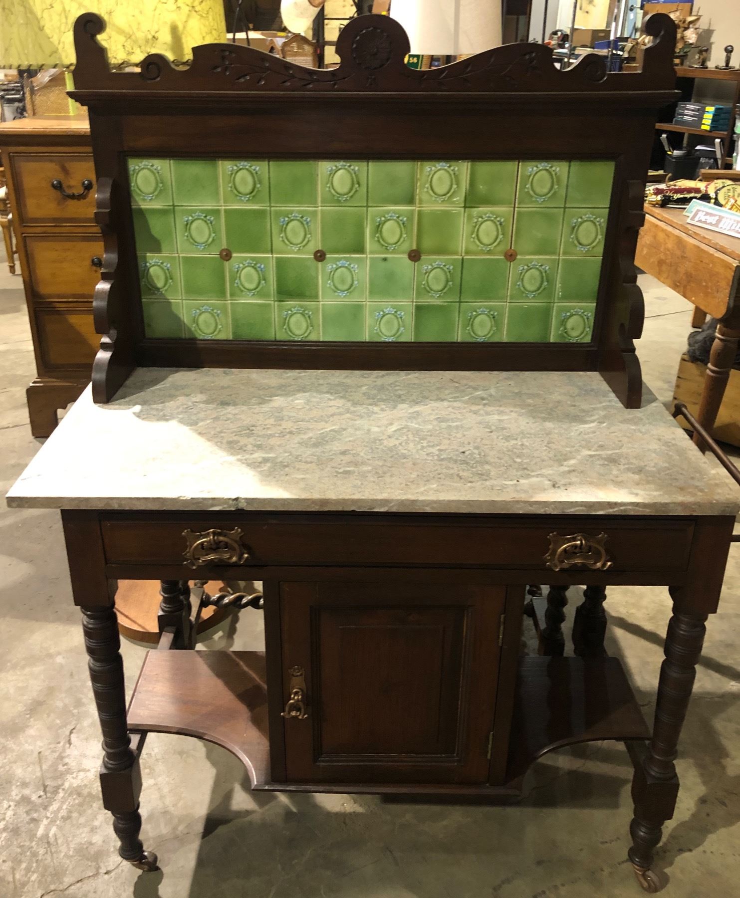Early 1900's mahogany wash stand w/ marble top & green tile back splash from the love showÊ