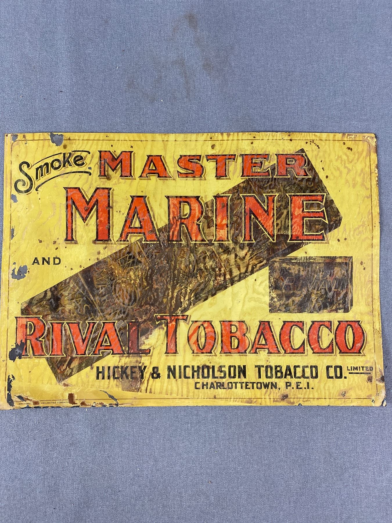 Early 1920's Master Marine/Rival Tobacco Tin Tacker Sign. Charlottetown PEI. Measures 9 3/4" x 13 1/2"