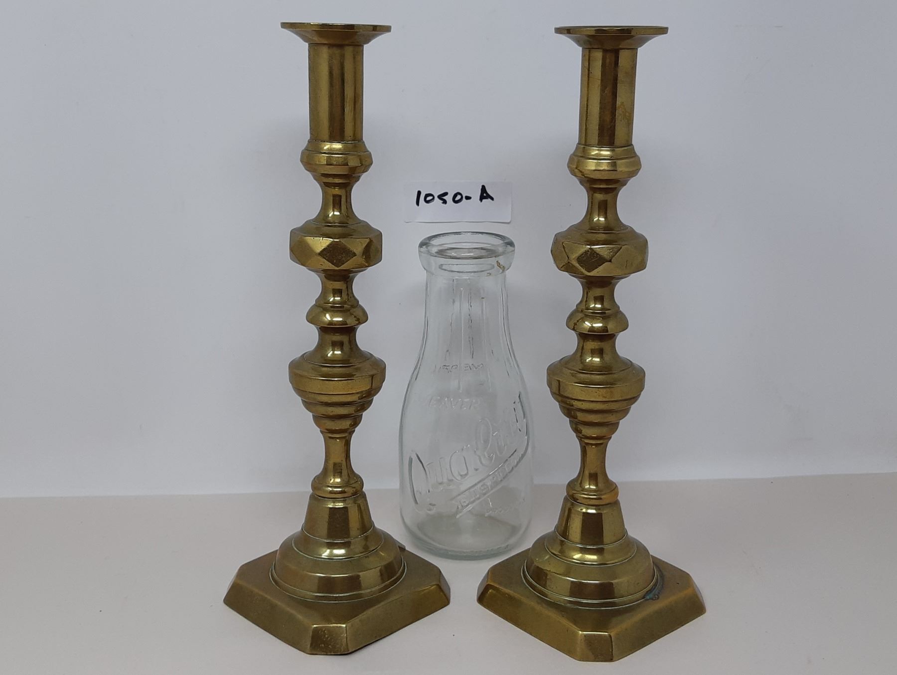 Early Milk Bottle Weaver Quality And 2 Beehive Victorian Candlesticks