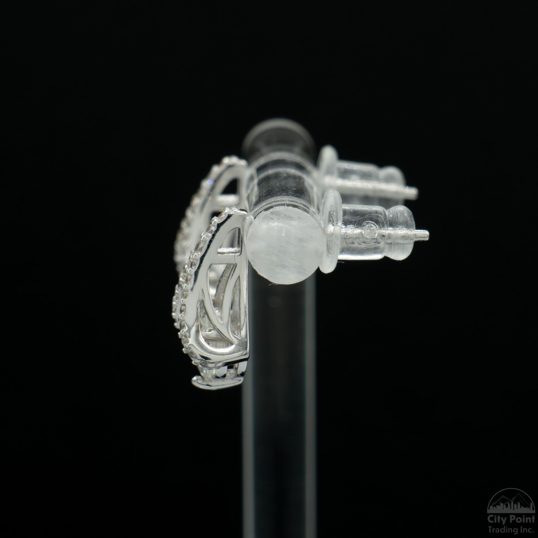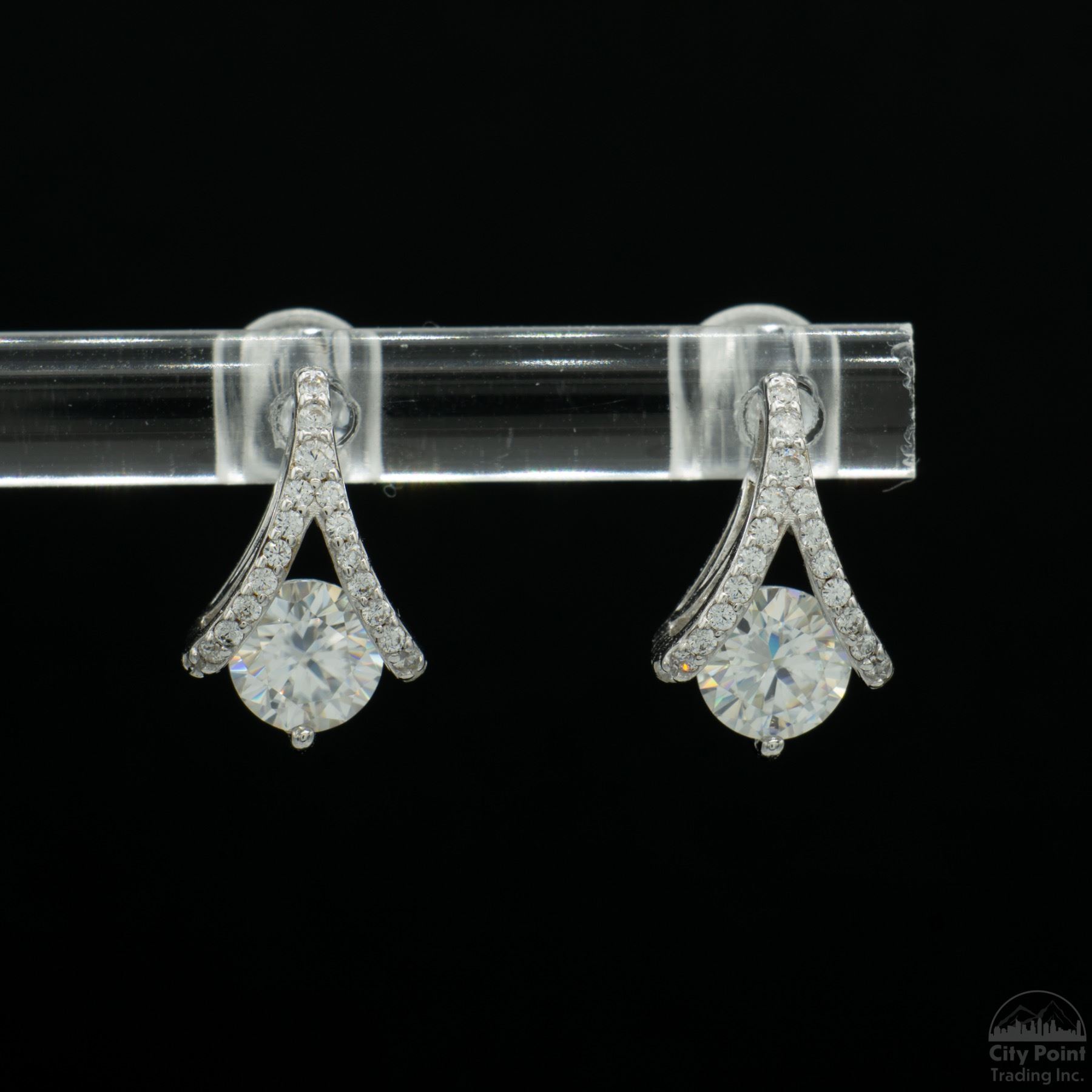 One pair of stamped S925 platinum-plated sterling silver earrings weighing 1.46 grams, each featuring a single round cut moissanite, approximately 0.40 carat. Condition is new. Comes with a box, pouch, and display box.
