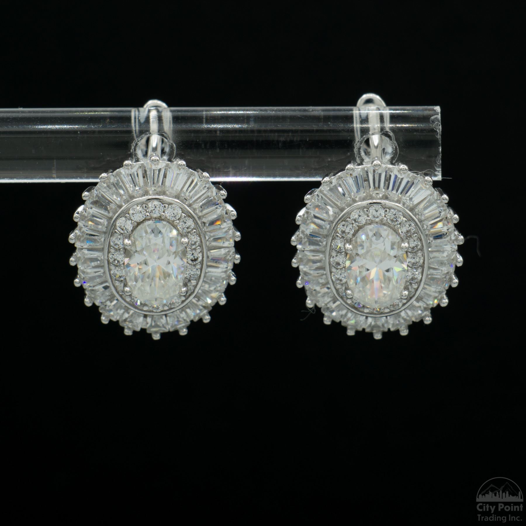 One pair of stamped S925 platinum-plated sterling silver earrings weighing 1.78 grams, each featuring a single oval cut moissanite, approximately 0.50 carat, accented by baguette cut moissanite side stones. Condition is new. Comes with a box, pouch, and display box.