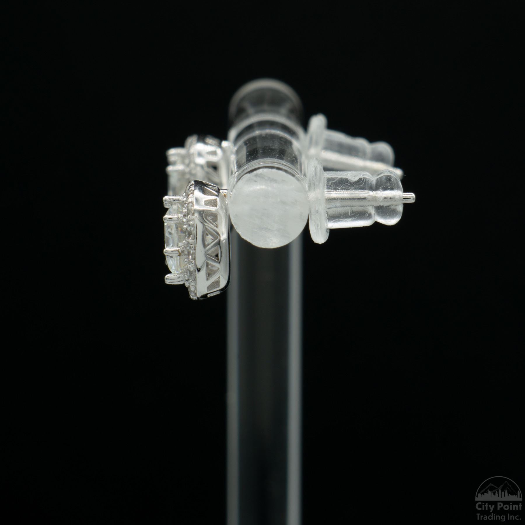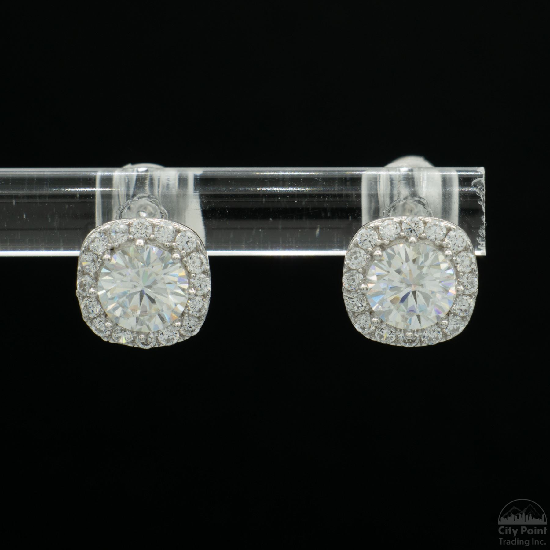 One pair of stamped S925 platinum-plated sterling silver earrings weighing 1.30 grams, each featuring a single round cut moissanite, approximately 0.50 carat. Condition is new. Comes with a box, pouch, and display box.