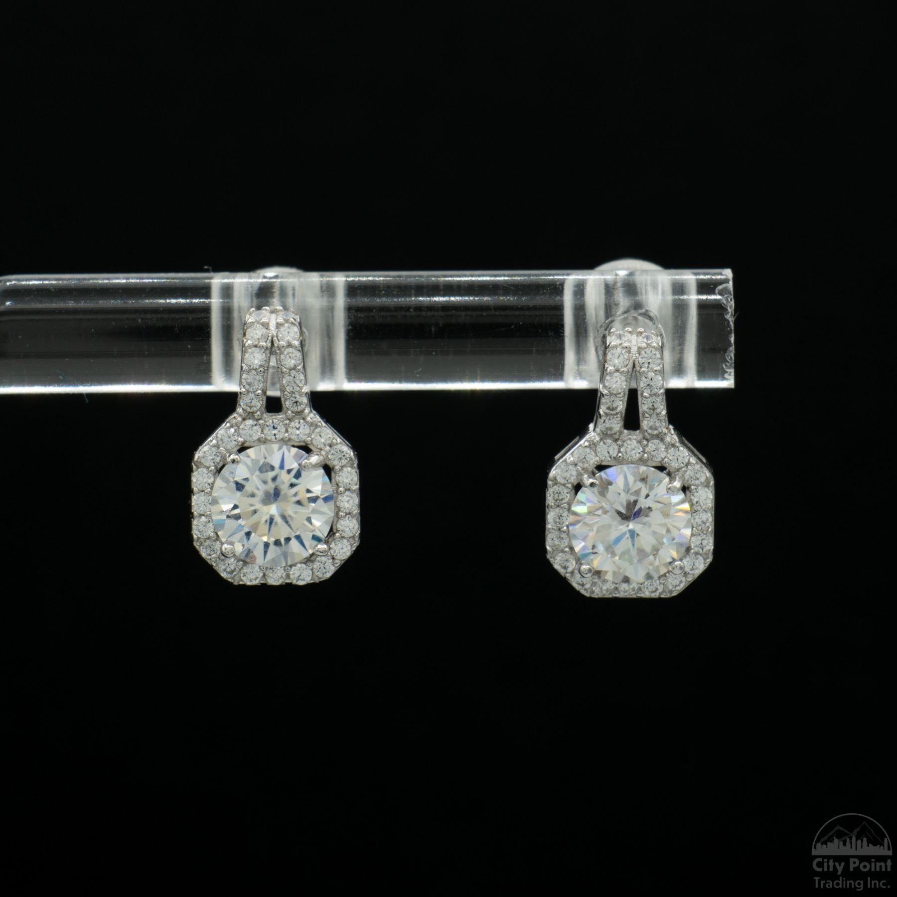 One pair of stamped S925 platinum-plated sterling silver earrings weighing 1.49 grams, each featuring a single round cut moissanite, approximately 0.50 carat. Condition is new. Comes with a box, pouch, and display box.