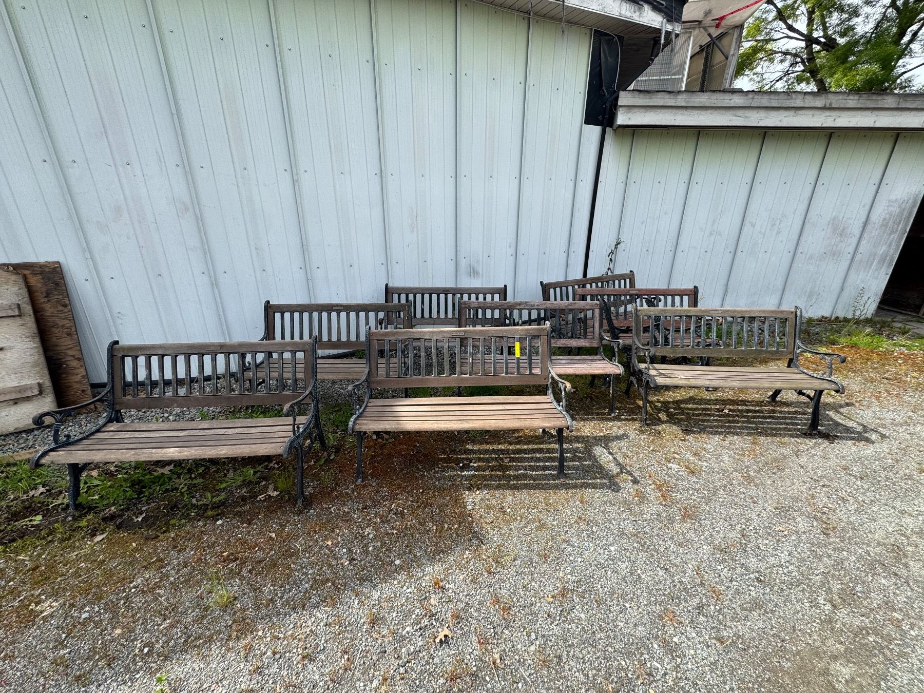Eight Berkeley Forge, cast-iron and wooden benches with spare ends