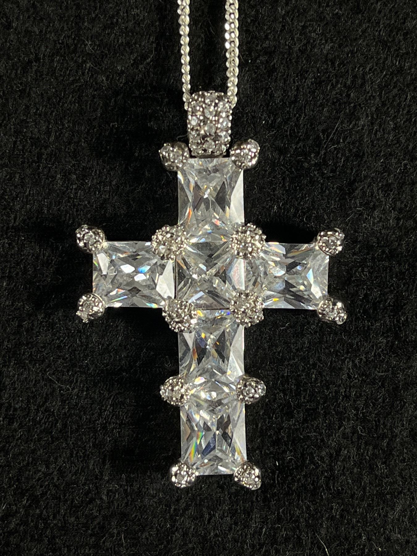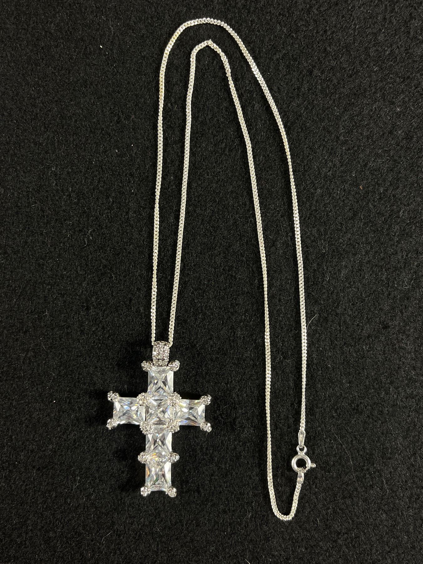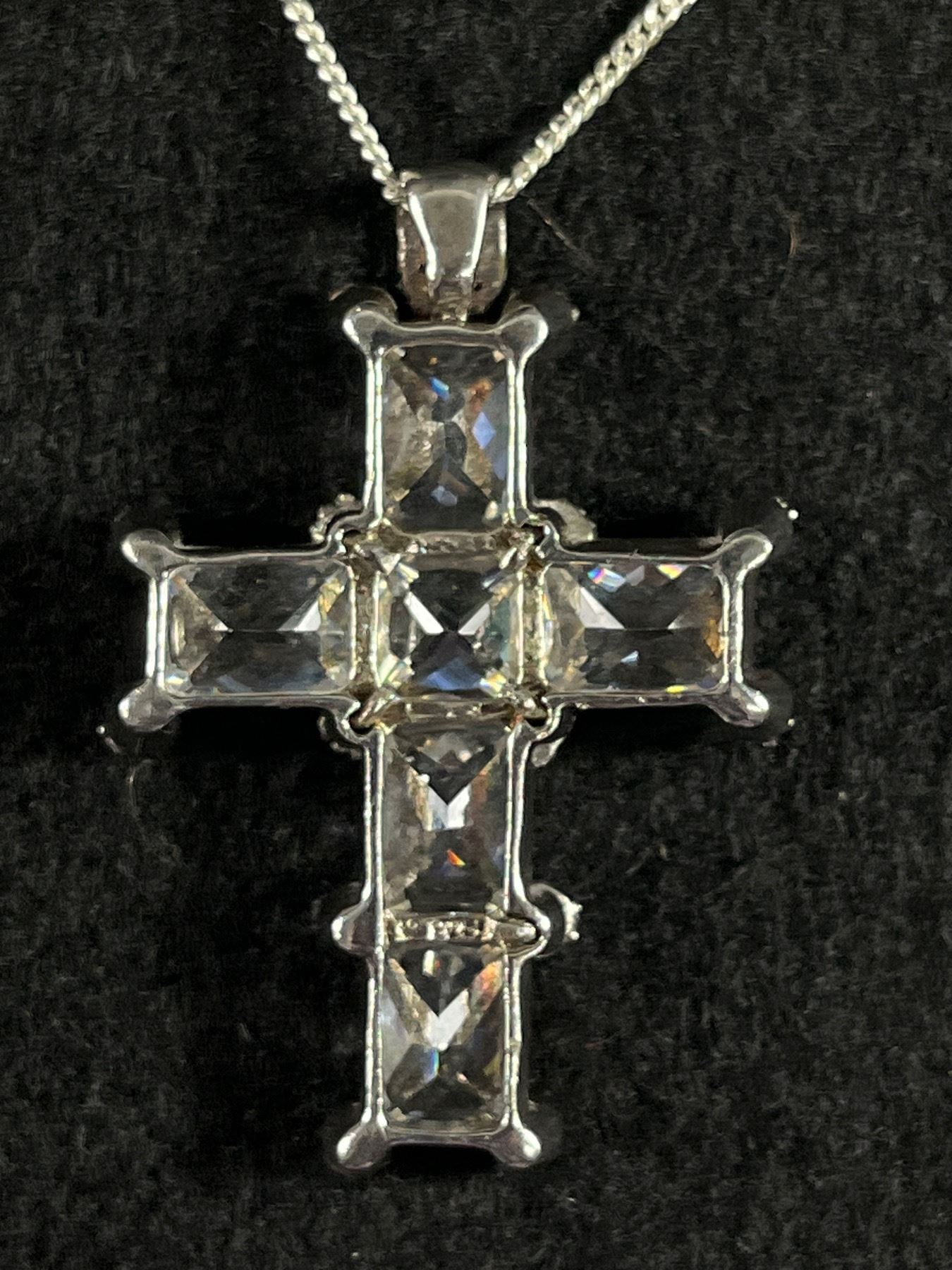 Elaborate Sterling Silver with Austrian Crystal Stones Cross Pendant with Italian 925 Sterling Silver Chain. Very Long 20.5 gr