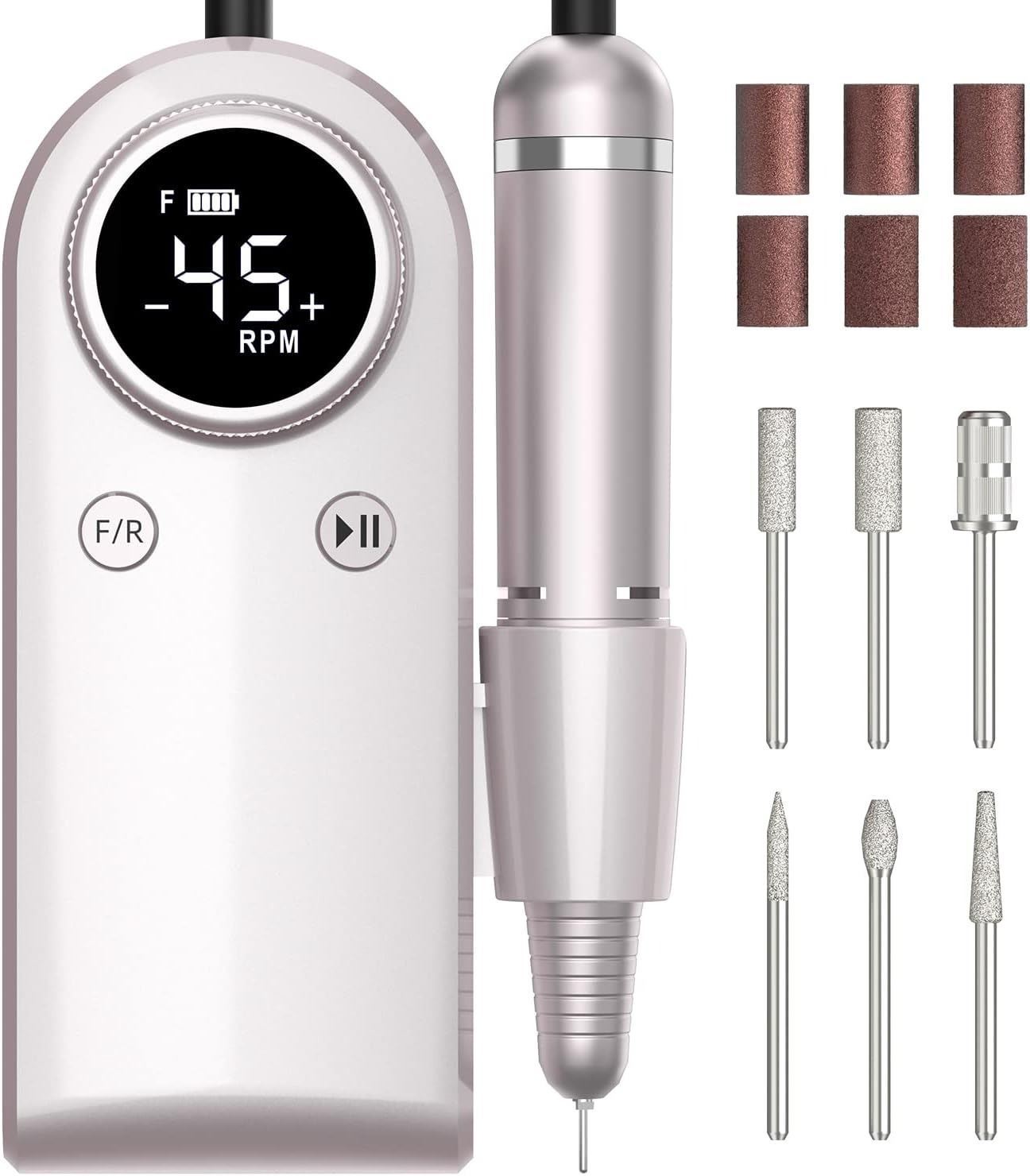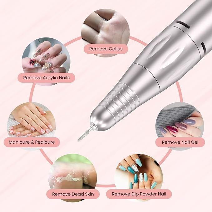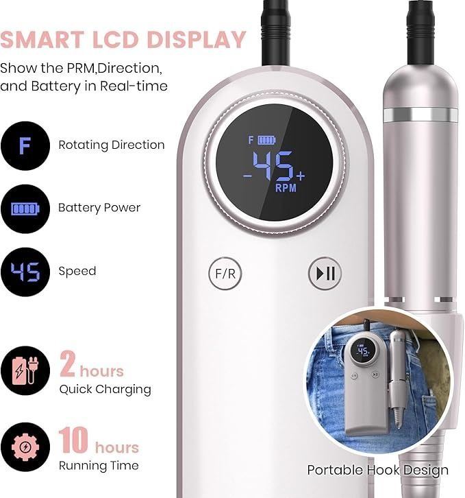 - Electric Nail Drill for Acrylic Nails: Professional 45,000 RPM Nail File Portable Rechargeable Nail Drill Machine Set for Acrylic Manicure Pedicure with Efile Bits Sanding and Bands for Salon/Home Use