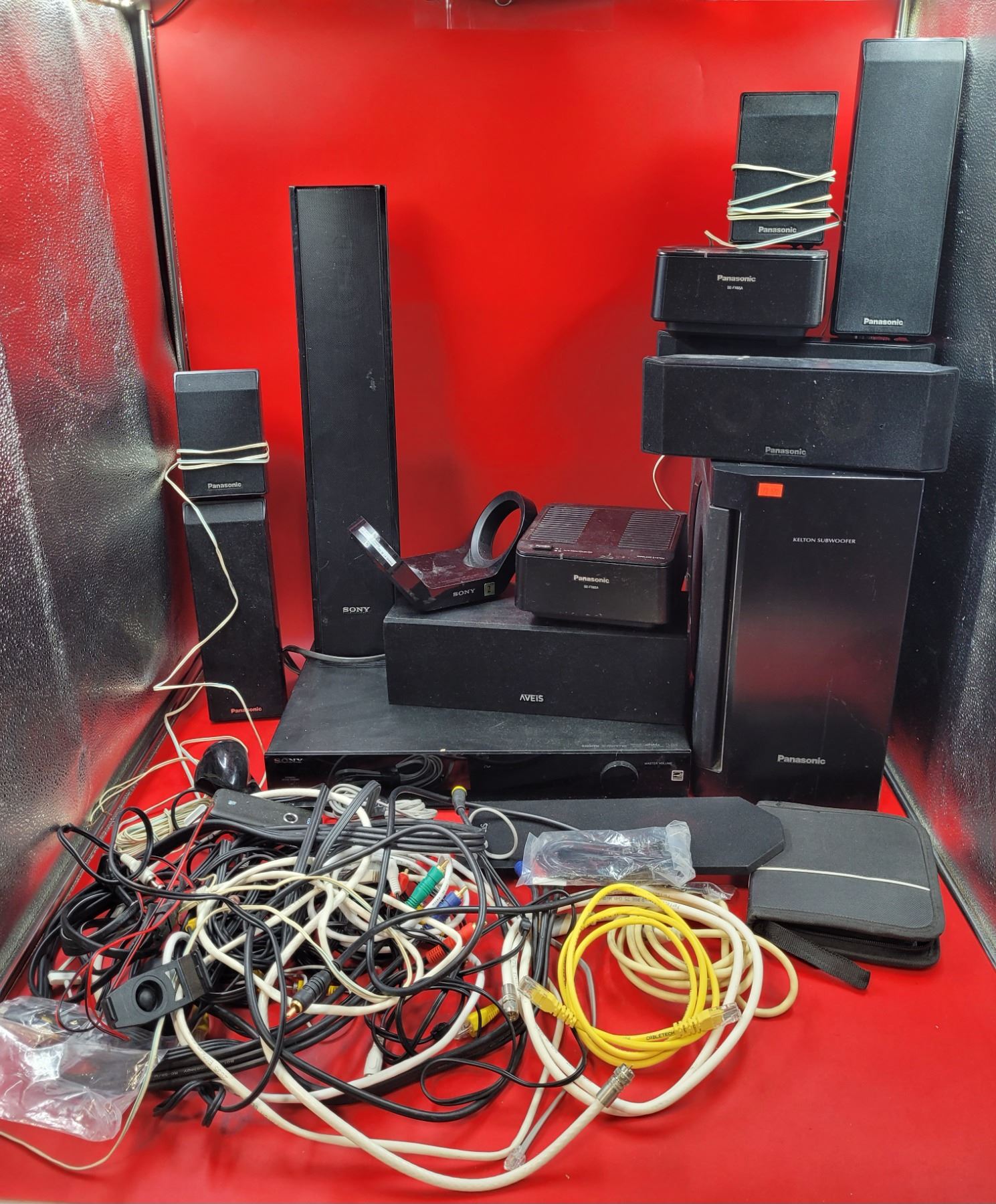 Electronics Lot w/ Speakers, Subwoofer, Assorted A/V Cords, & More