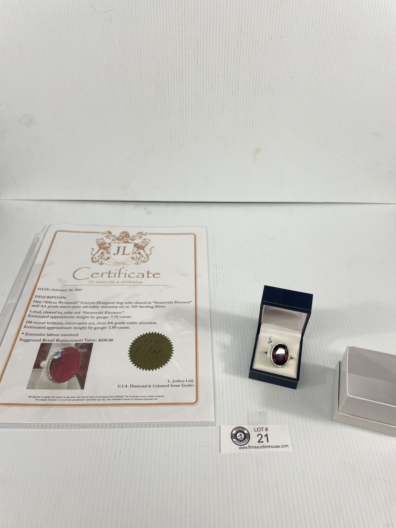 "Ellysa Weinstein" Custom Designed Zirconia & 925 Sterling Silver Ring w/Certificate Of Analysis And Appraisal. Suggested Retail Replacement Value $650.00