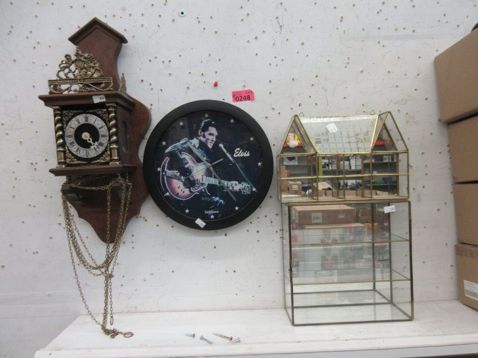 Largest is curio shelf is 4" x 10" x 10". Wood clock is missing weights and a hand. As is.