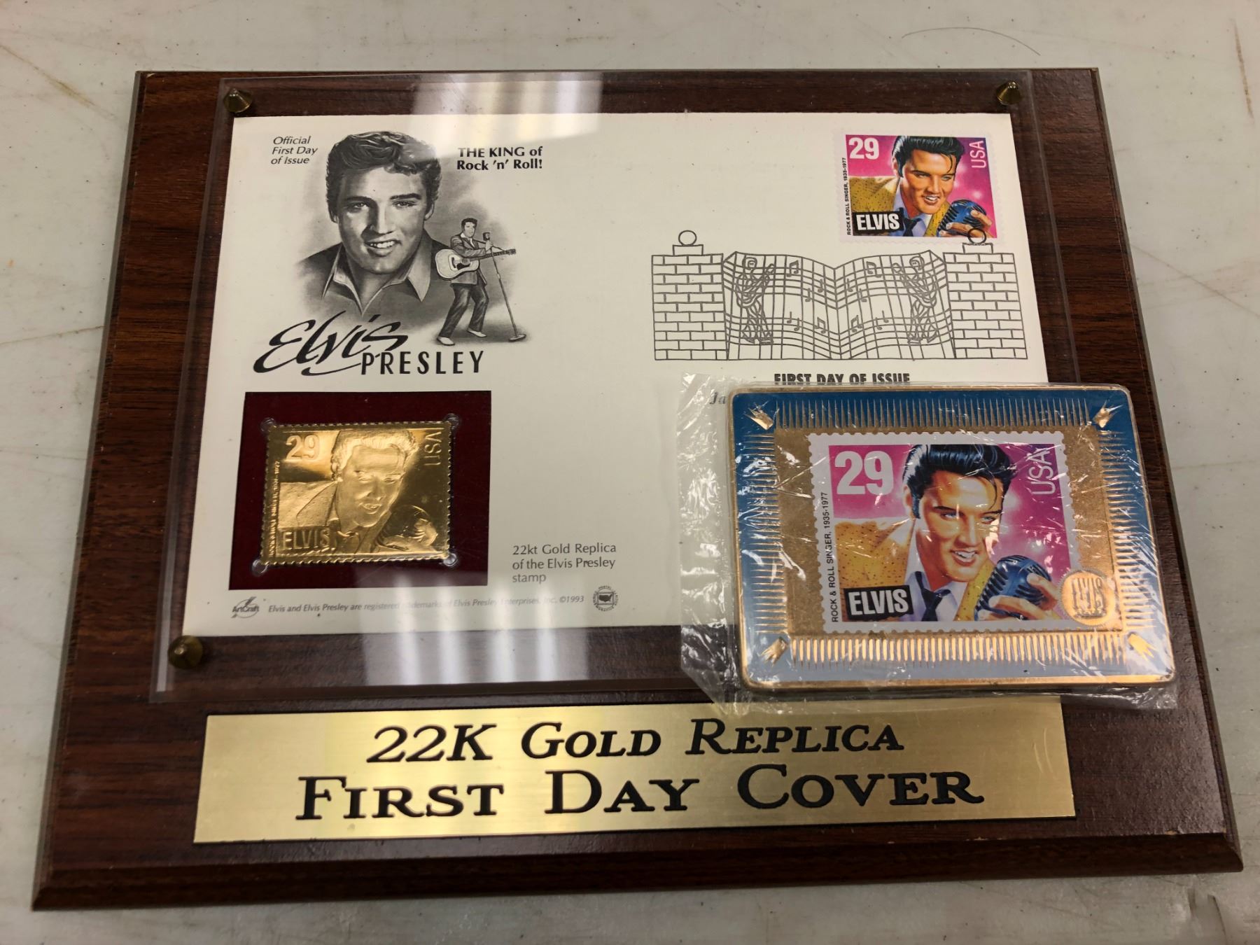 Elvis Presley 22K gold replica First Day Cover & metallic Elvis Presley promotional sample stamp card