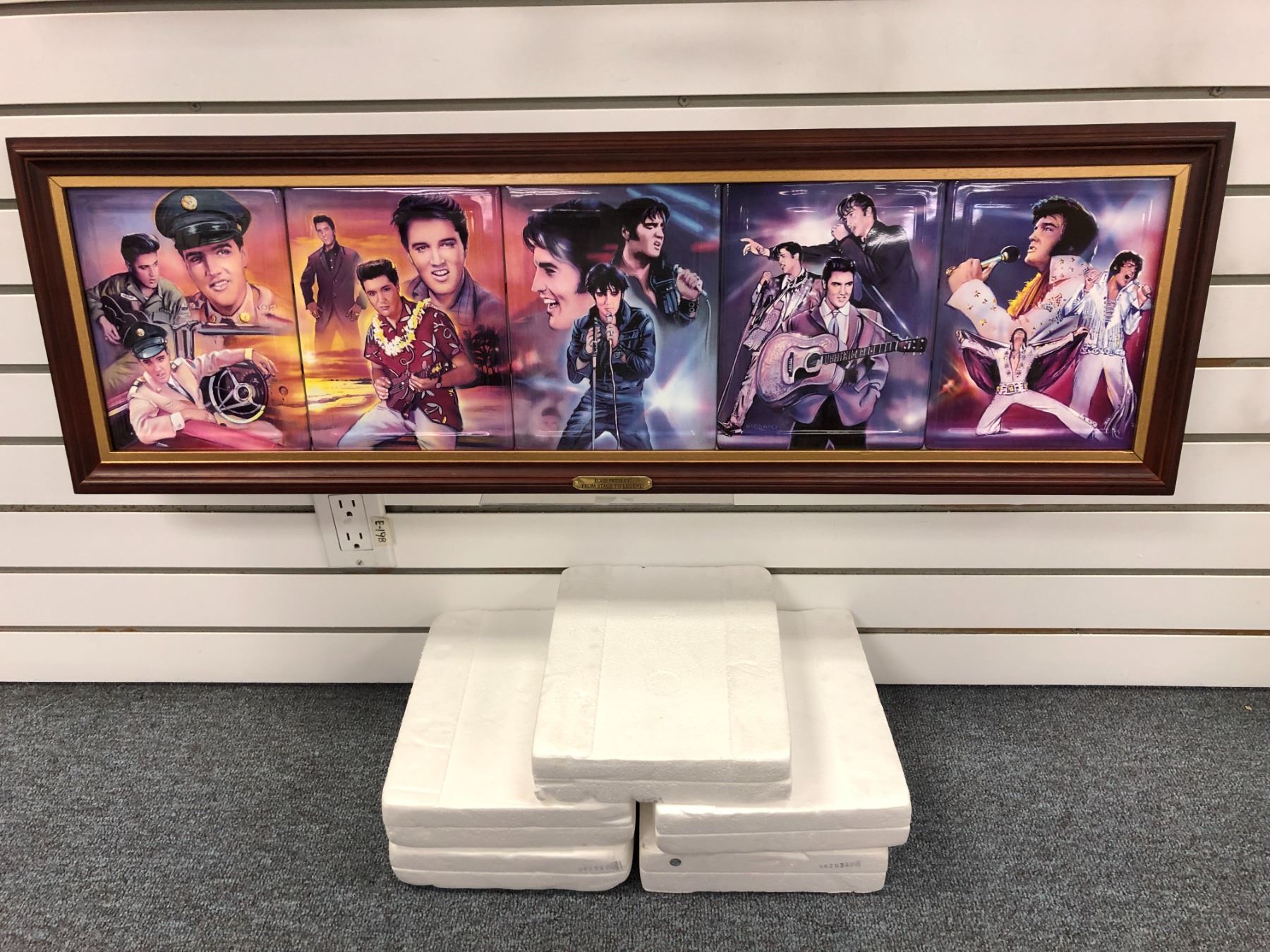 Elvis Presley From Stage to Legend 6 pc. collector's plate set - 5 plates w/ boxes & COA & custom frame (38in x 12in)