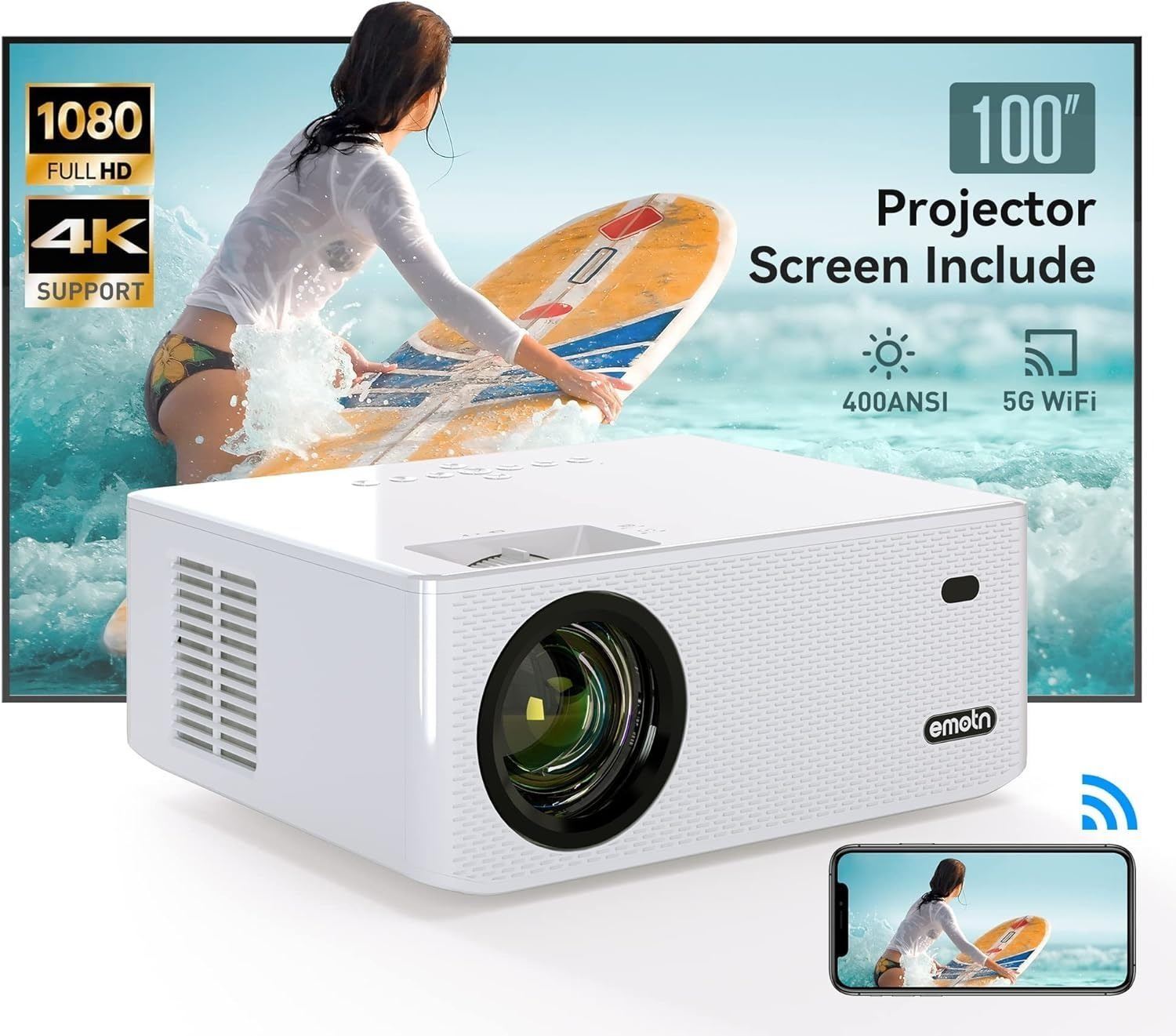 Emotn O1 5G WiFi Bluetooth Projector, 400 ANSI Lumens, Native 1080P Mini Projector 4K Supported, 300" Portable Movie Projector with Screen, Home Theater Projector Compatible with TV Stick/Phone/PC
