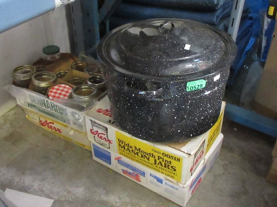 Enameled Canning Pot and 2 Boxes of Assorted Jars