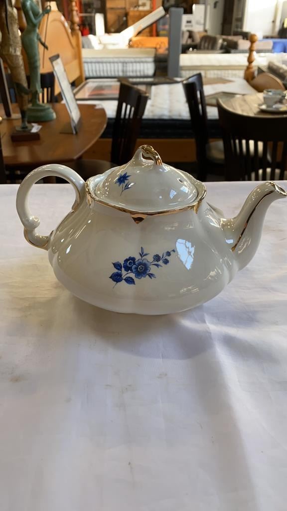 English ironstone teapot, old english rose teacup and saucer with 2 SNP figures