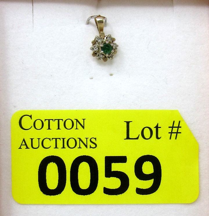 3.5 mm Center Emerald surrounded by 5 white topaz. Bale needs repair. Diameter of pendant is 7.3 mm. Total weight including stones: 1 gram.