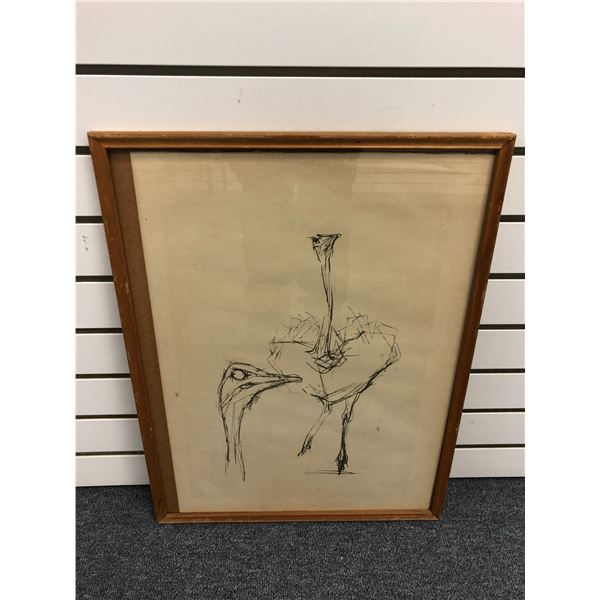 Framed original charcoal pencil sketch drawing "Ostrich" signed by artist bottom right corner - appr