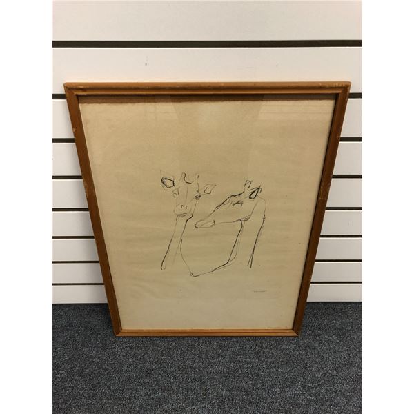 Framed original charcoal pencil sketch drawing "Giraffe" signed by artist bottom right corner - appr