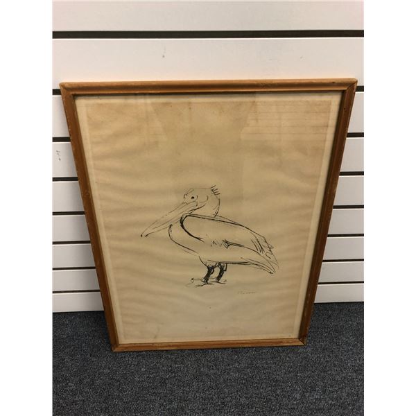 Framed original charcoal pencil sketch drawing "Pelican" signed by artist bottom right corner - appr