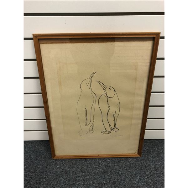 Framed original charcoal pencil sketch drawing "Penguins" signed by artist bottom right corner - app