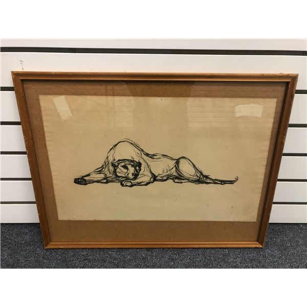 Framed original charcoal pencil sketch drawing "Mountain Lion" signed by artist bottom right corner - approx. 19in x 12in (believed to be ...
