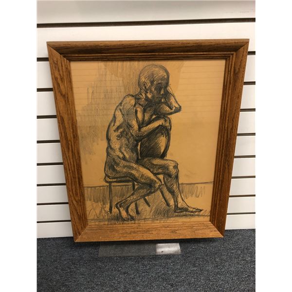 Frank Molnar (1936-2020) - framed nude charcoal pencil sketch drawing signed 1999 - old man sitting