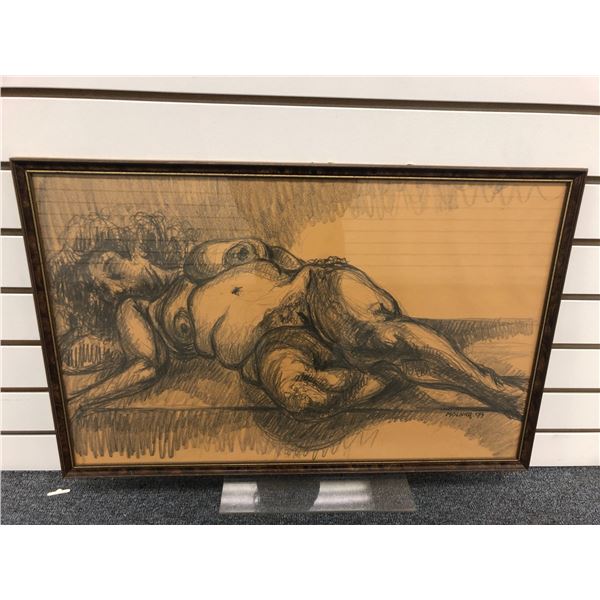 Frank Molnar (1936-2020) - framed nude charcoal pencil sketch drawing signed 1999 - woman on bed - 2
