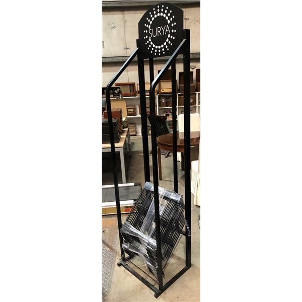 Approx. 6ft tall x 1 1/2ft wide all glass showcase w/ black base from the show (missing front door & glass shelves)