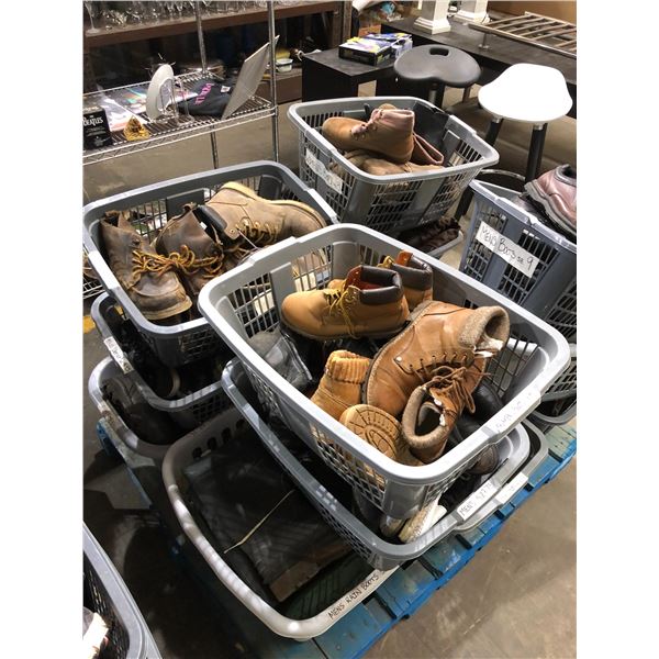 Pallet lot of 13 gray laundry baskets filled w/ assorted boots & shoes from the show