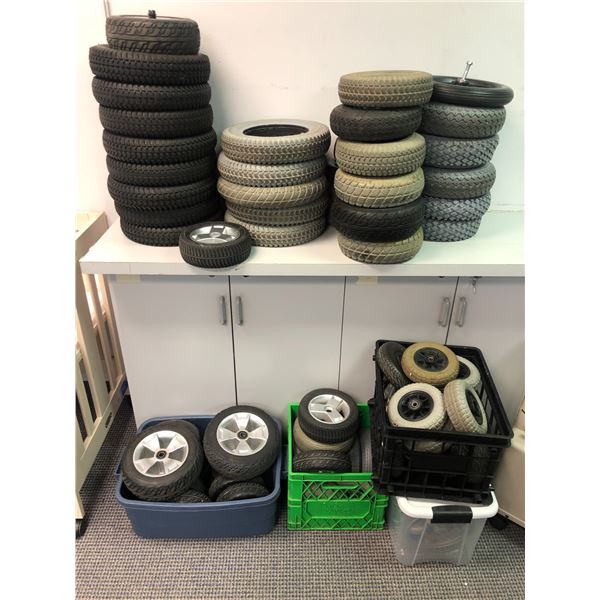 Large group of assorted power mobility scooter wheels