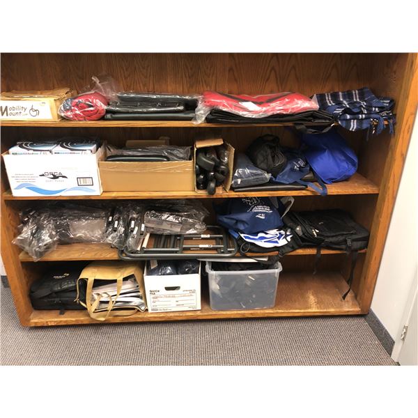 Four shelves of assorted medical assist mobility scooters & wheelchair parts & accessories