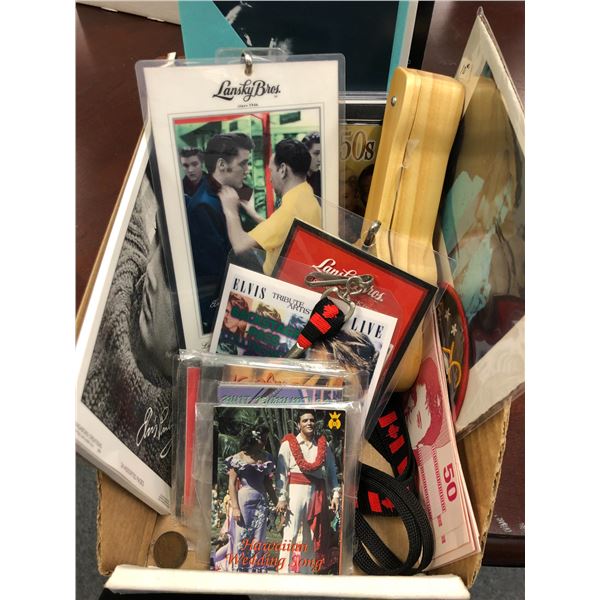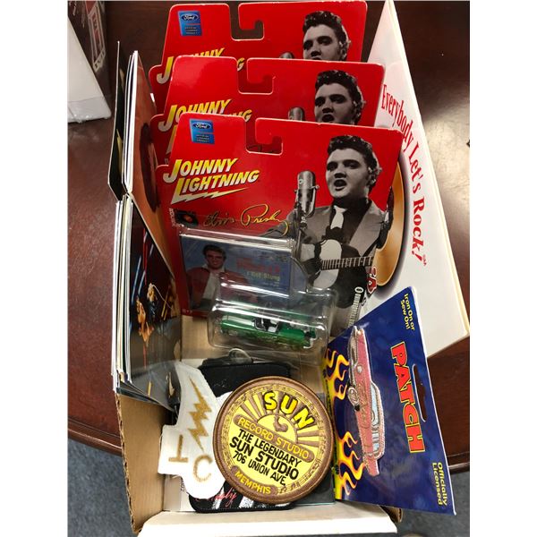 Box of assorted Elvis Presley memorabilia - die cast metal cars/ sew on patches/ post cards etc.