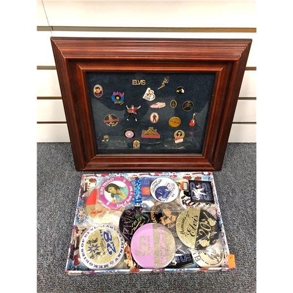Framed Elvis Presley pin collection & box of assorted buttons