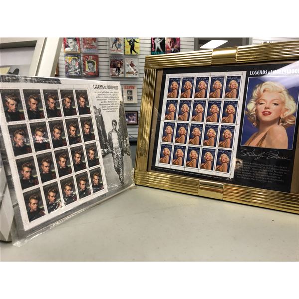 Full sheet of framed Marilyn Monroe collector's stamps & full sheet of James Dean collector's stamps