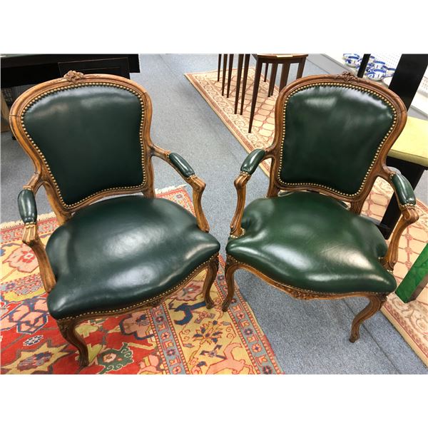 Pair of early 1900's green leather upholstered mahogany arm chairs
