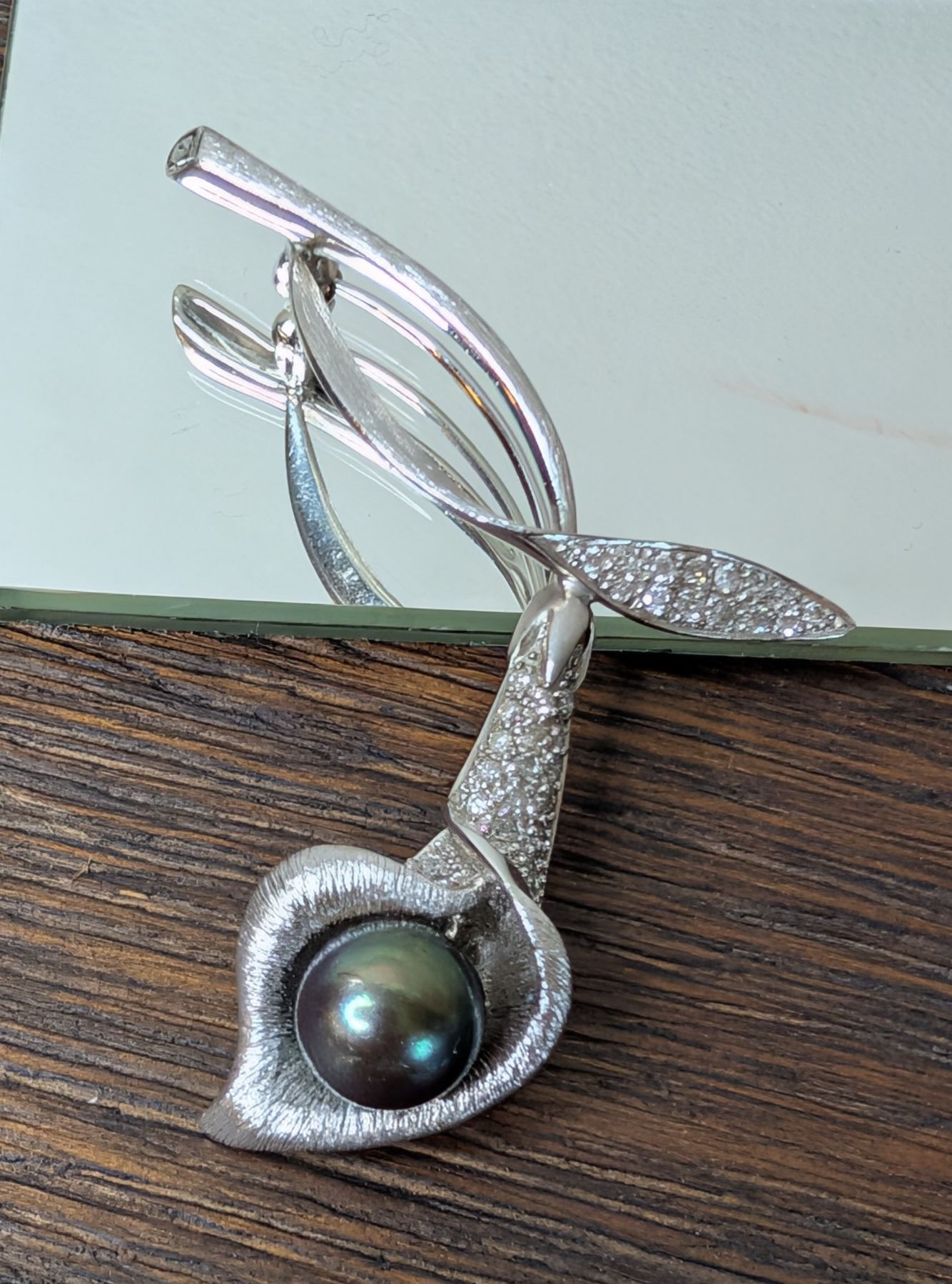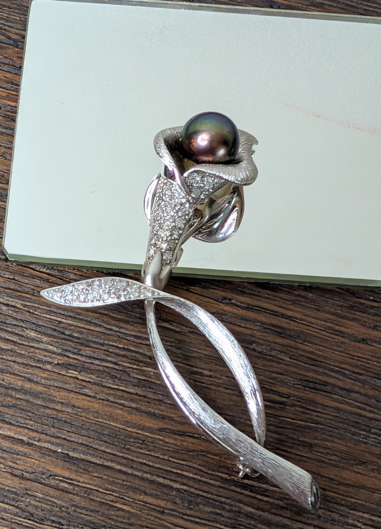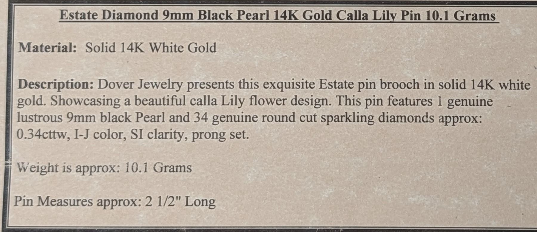 14k white gold and diamond with 9mm black pearl Calla Lily Pin Brooch - see attached description
