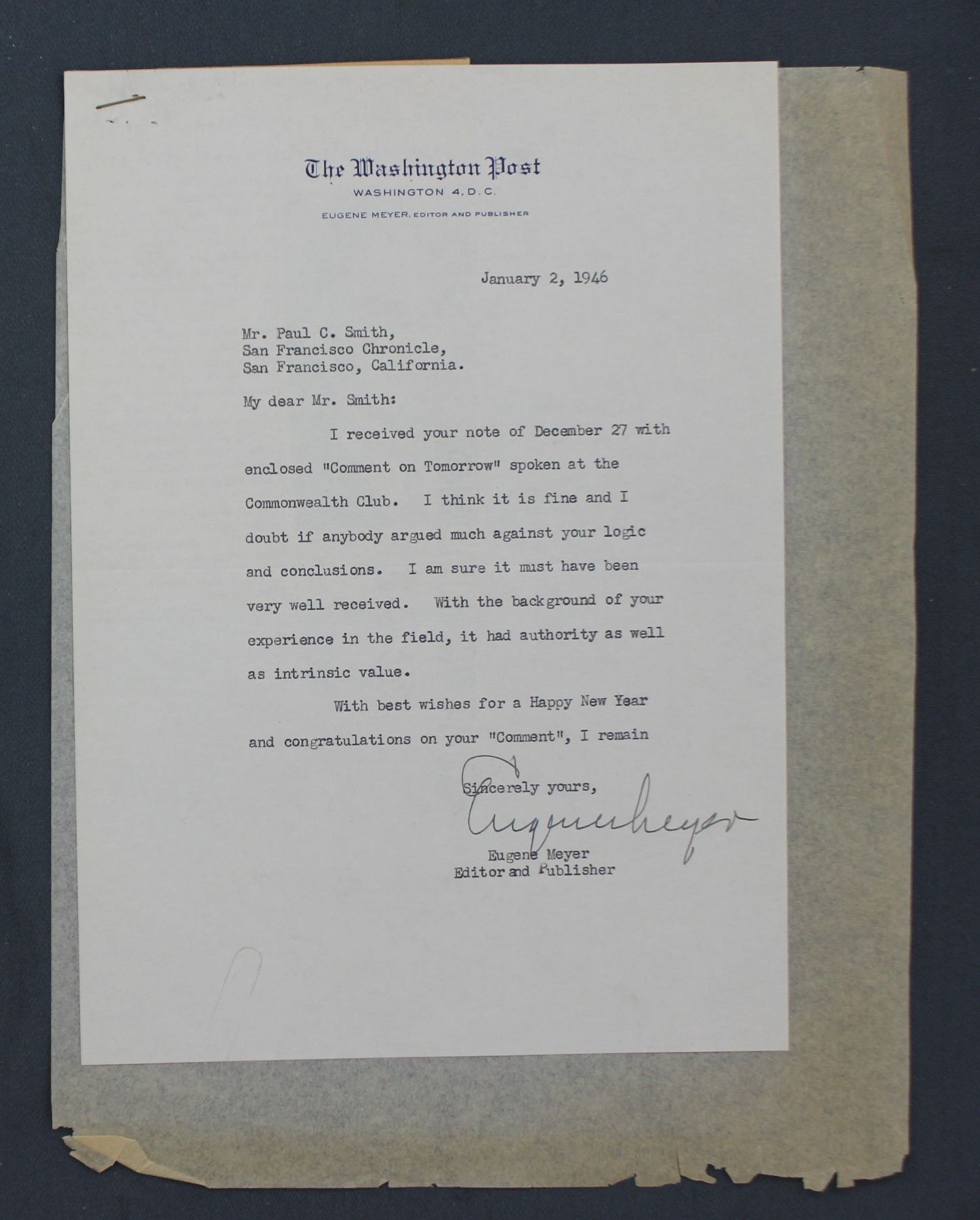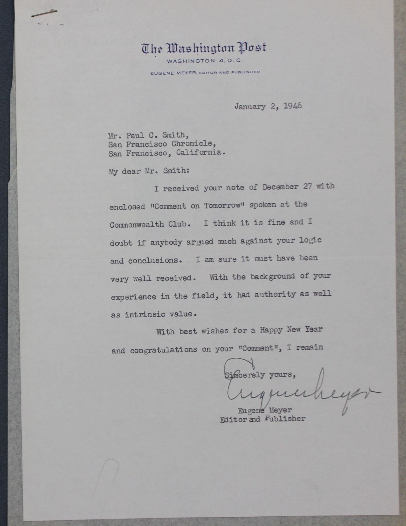 Eugene Meyer Letter Signed as Washington Post Editor and Publisher. One page, 9 5/8" x 6 7/8"; January 2, 1946.