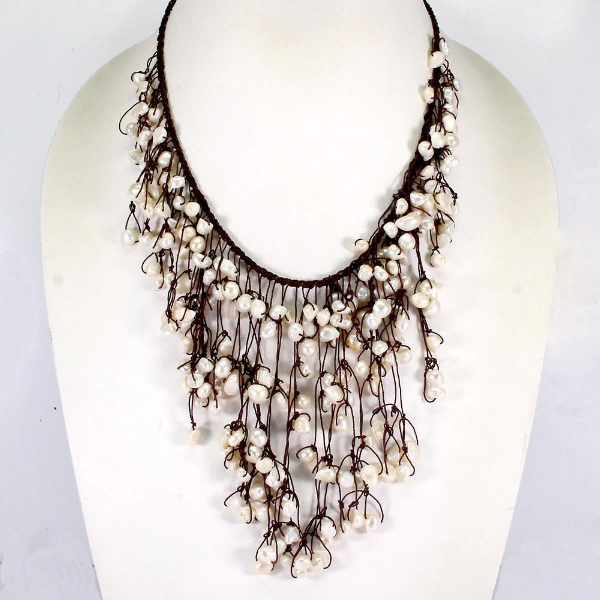 NECKLACE.......LENGTH (INCHES)19.5MAIN STONEPEARLOTHER GEMSTOTAL WEIGHT357.68 CT (TOTAL WEIGHT OF SILVER + STONE)DIMENSION* PEARL 6.0 TO 9.0 X 7.0 MM. * STONES PART LENGTH 280.0 X 110.0 MM.MAIN STONE SHAPEBAROQUEMAIN STONE COLORCREAMY WHITECLARITY/GRADEOPAQUELUSTEREXQUISITETREATMENT-CULTURED FRESHWATERORIGIN- Japan;HARDNESS2.5 - 4.5