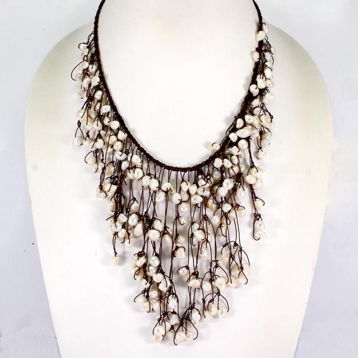 NECKLACE.......LENGTH (INCHES)19.5MAIN STONEPEARLOTHER GEMSTOTAL WEIGHT357.68 CT (TOTAL WEIGHT OF SILVER + STONE)DIMENSION* PEARL 6.0 TO 9.0 X 7.0 MM. * STONES PART LENGTH 280.0 X 110.0 MM.MAIN STONE SHAPEBAROQUEMAIN STONE COLORCREAMY WHITECLARITY/GRADEOPAQUELUSTEREXQUISITETREATMENT-CULTURED FRESHWATERORIGIN- Japan;HARDNESS2.5 - 4.5