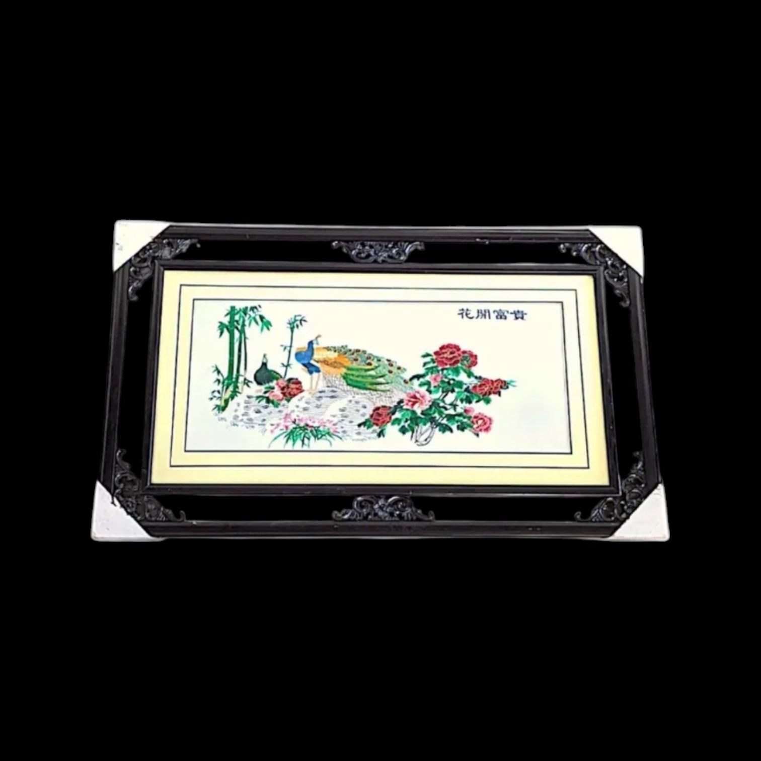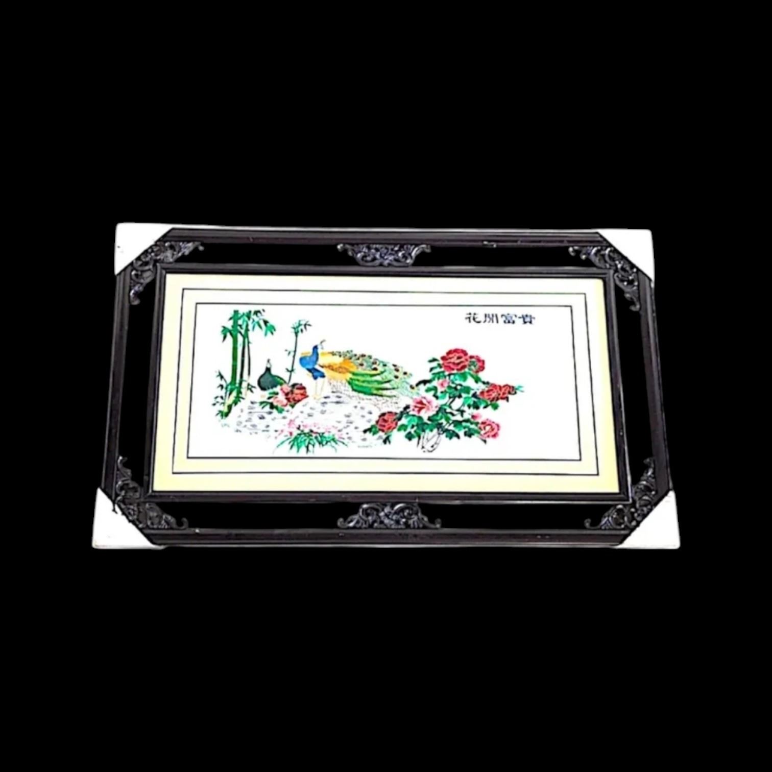 Exquisite Silk Framed Peacock Needlepoint Embroidery - Wood Frame