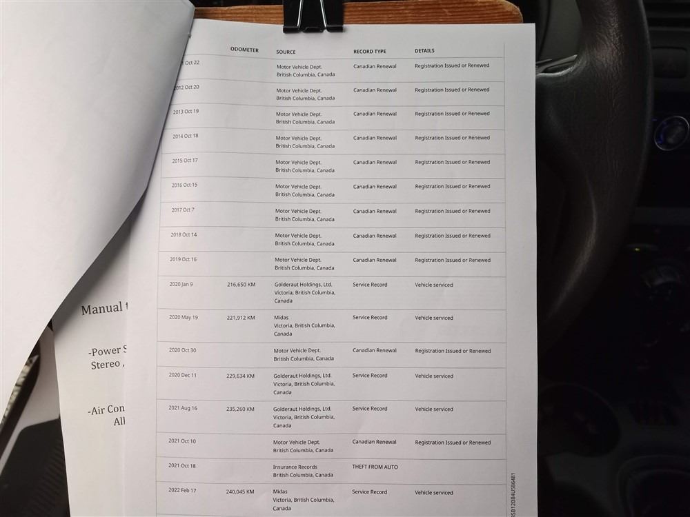 Manual transmission and 2.4 Litre Engine, 4 cylinder , Front Wheel Drive, 253865 KilometersWhite, 5 Passenger Declarations - Damage Under $2000 -Power Steering, Power Brakes, Intermittent Wipers, Dual Air Bag, AM/FM Stereo , Rear Defroster, Bucket Seats, Anti Lock Brakes, Front Disc Brakes-Air Conditioning, Power Windows, Power Locks, Keyless Entry, Tilt Steering, Alloy Wheels, Anti Theft, CD Player, Aftermarket Stereo, Roof RackAuction Notes : Brakes - Front 80 % Rear 50 %