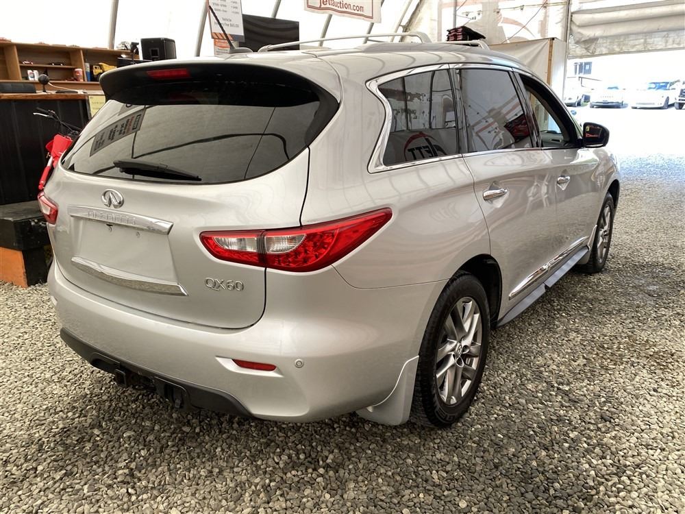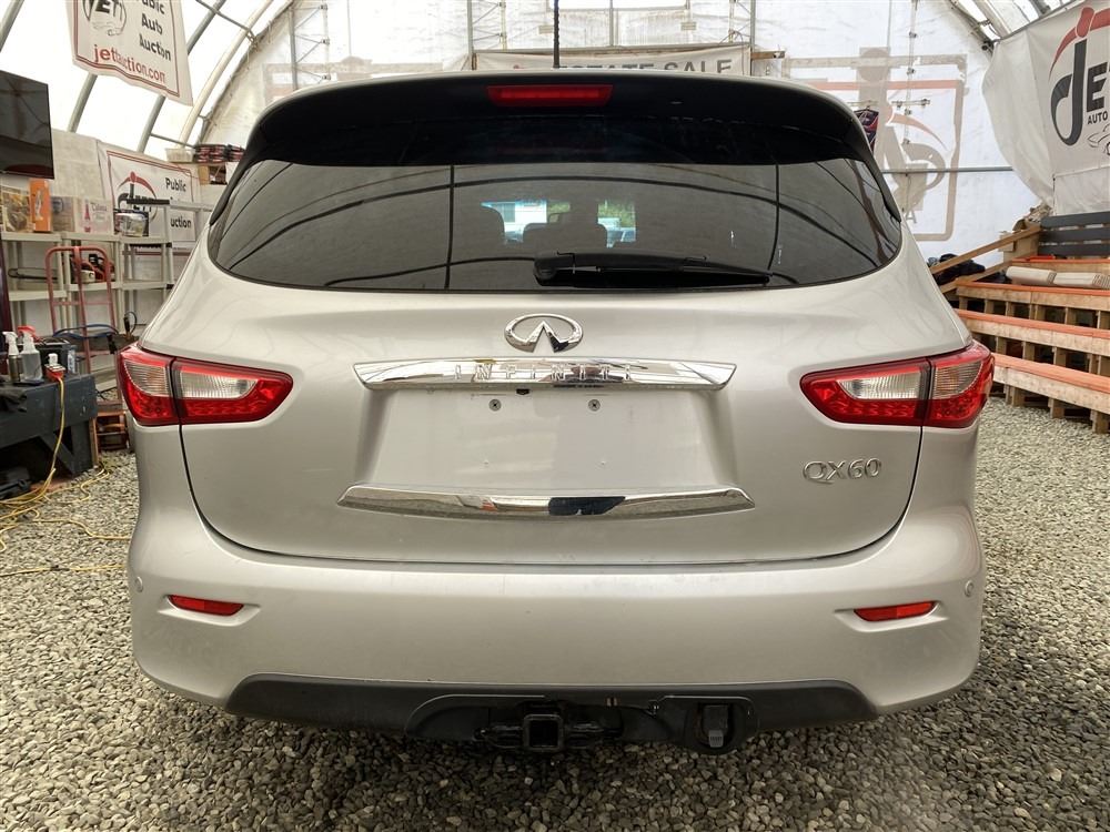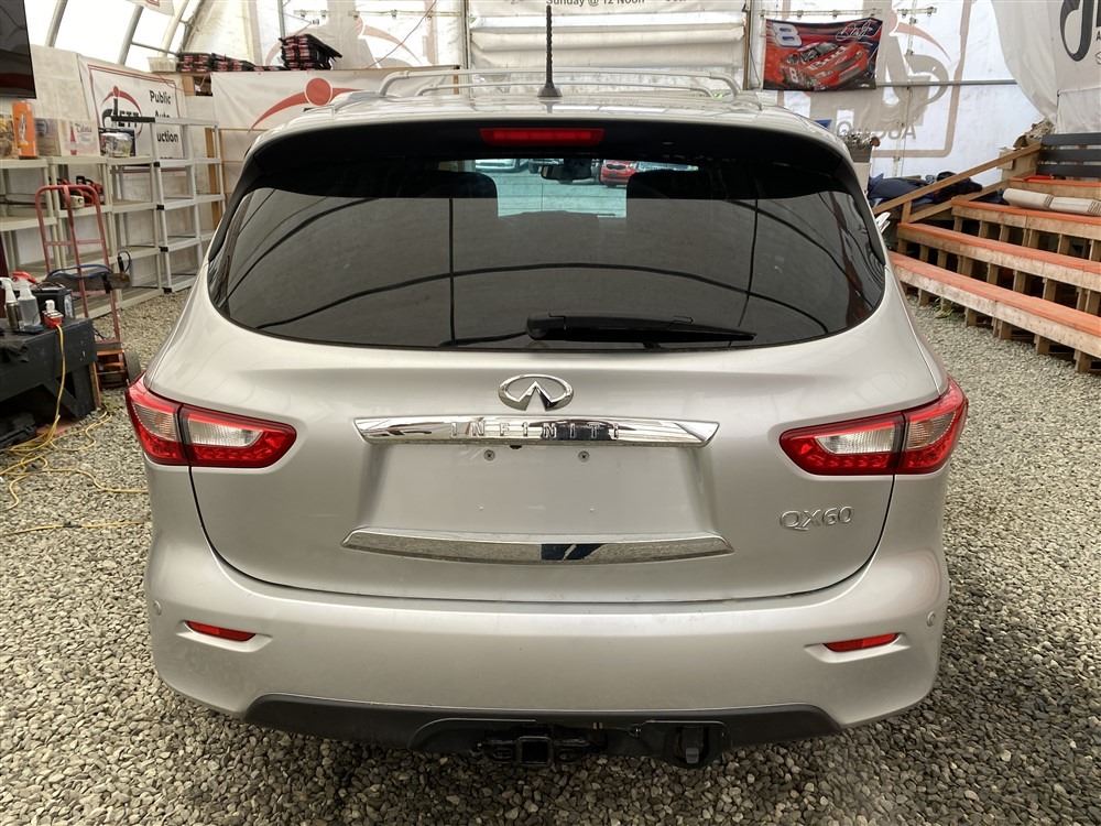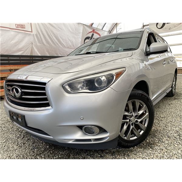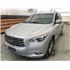 2015 INFINITI QX60, SILVER, 265290 KMS, 3.5L, 6 CYLINDER, GASOLINE, AUTOMATIC, TRANSMISSION, ALL WHEEL DRIVE, 7 PASSENGER. DECLARATIONS:1 ACCIDENTS, 1 GLASS CLAIM, TOTALING $2940.AIR CONDITIONING, POWER WINDOWS, POWER LOCKS, KEY-LESS ENTRY, TILT STEERING, CRUISE CONTROL, ALLOY WHEELS, DUAL AIR BAGS, POWER SUNROOF, CD PLAYER, LEATHER SEATS, INFOTAINMENT CENTER, NAVIGATION, BACK UP CAMERA, TRACTION CONTROL, STEERING WHEEL CONTROLS, ROOF RACK, TOW PACKAGE, CHIP OR CRACK IN WINDSHIELD, PUSH-BUTTON START, AUCTION NOTES:, SEE WEBSITE FOR CARFAX, STOCK #:J507643. DECLARATIONS: EX-LEASE NOT MECHANICALLY INSPECTED, NOT SUITABLE FOR TRANSPORTATION. MUST TOW.1 ACCIDENTS 1 GLASS CLAIM, TOTALING $2940.