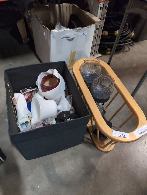 FABRIC BOX AND RACK OF COLLECTIBLES AND DECOR