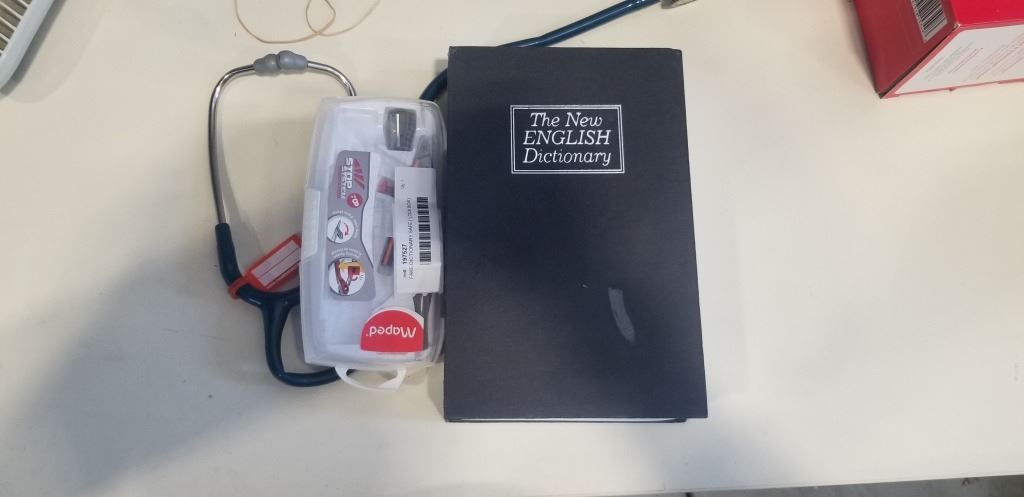 FAKE DICTIONARY SAFE ( LOCK BOX) UNLOCKED, NO COMBO AND STETHOSCOPE, RETRACTOR SET