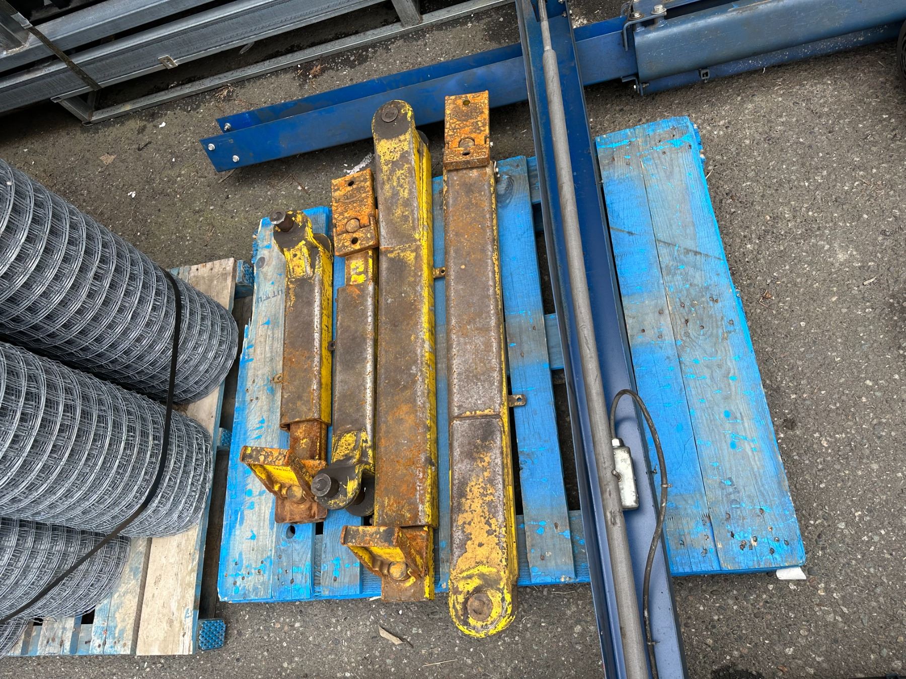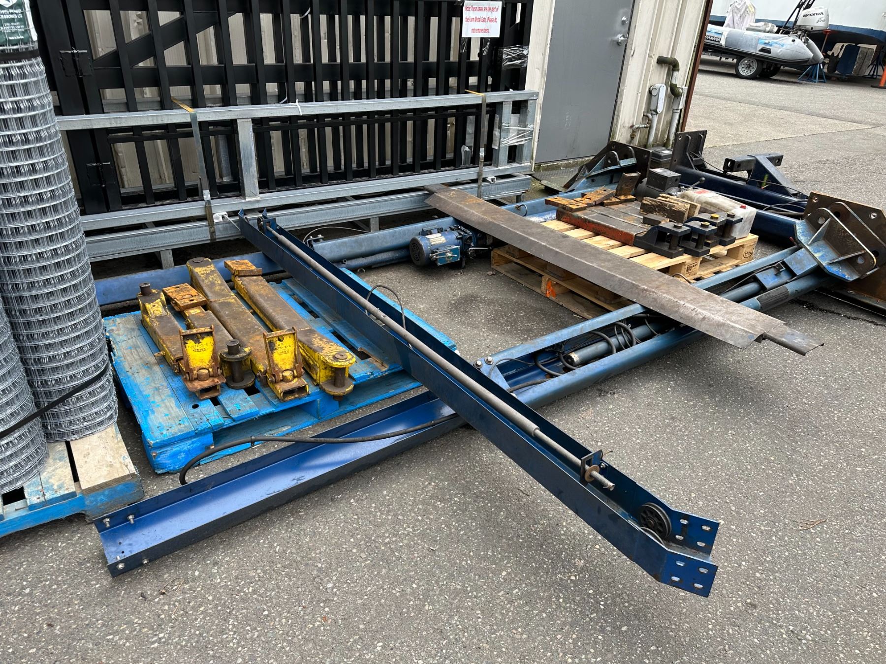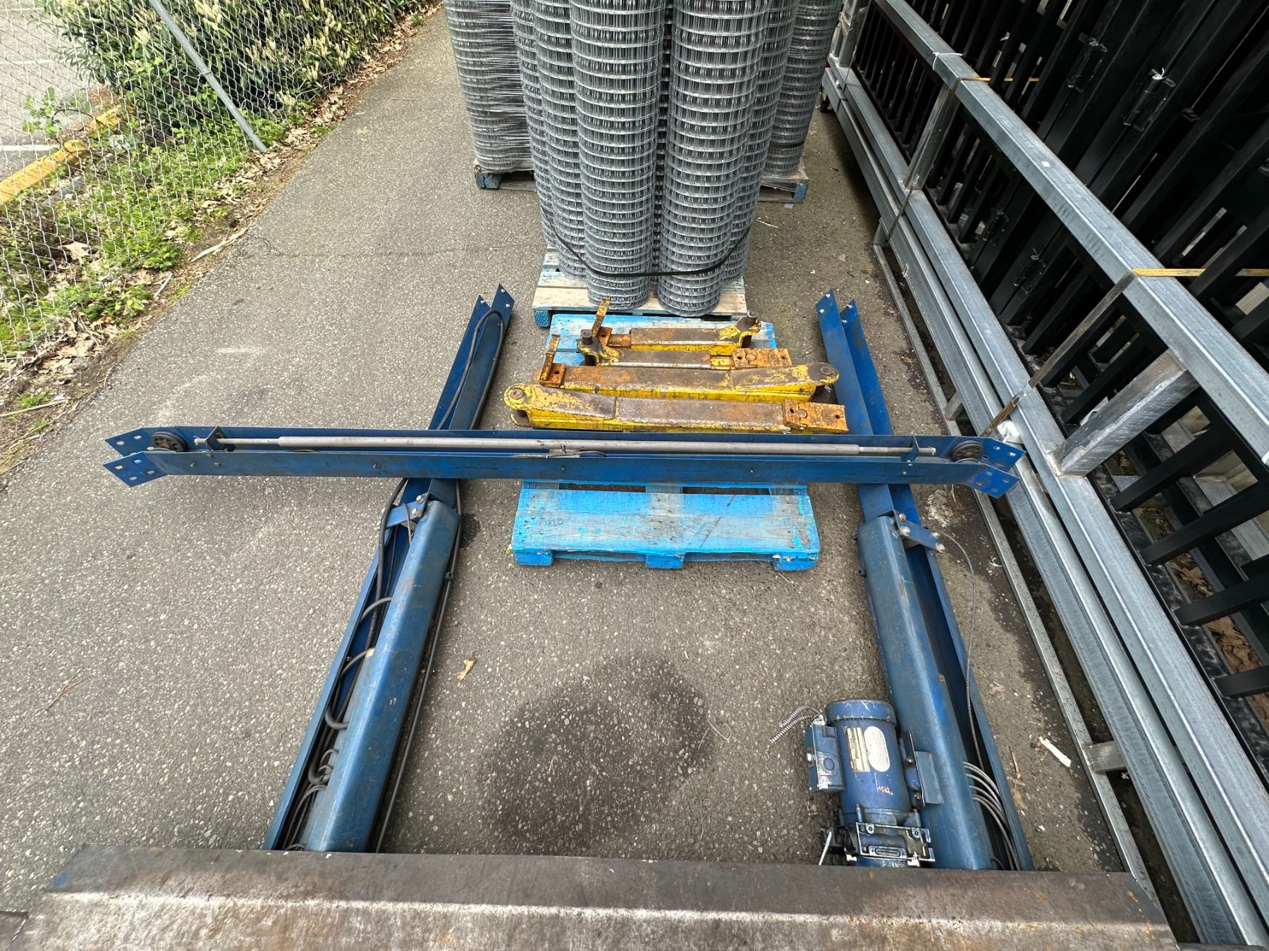 FENNER BLUE 12' HYDRAULIC 2 POST 4 POINT AUTOMOTIVE VEHICLE HOIST WITH UPPER SUPPORT BAR *DISASSEMBLED FOR TRANSPORT*